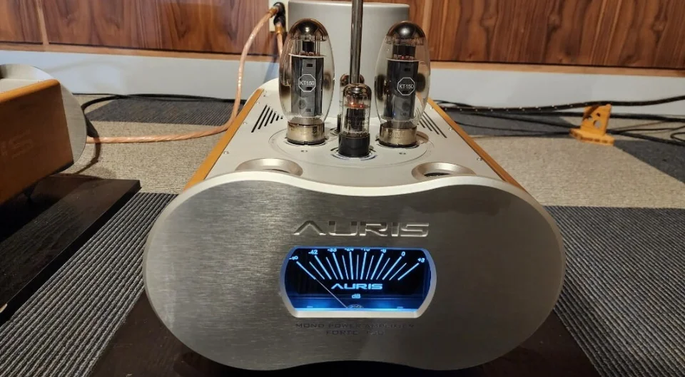 The title of the first mass-produced tube amplifier went to the Auris Forte 150, consisting of separate monophonic blocks, each with a power output of 100 W. The device is based on two KT150 tetrode vacuum tubes and two 6SN7 triodes, which are covered by a dome made of heat-resistant tempered glass for better protection against damage. Notably, the amplifier features a hand-wound output transformer on a double C-core with a power rating of 200 W, which ensures signal linearity across a wide frequency range from 15 Hz to 50 kHz. The amplifier's design includes Mundorf capacitors, as well as WBT silver connectors and signal path wires, demonstrating Auris Audio’s commitment to uncompromising quality and sound perception.