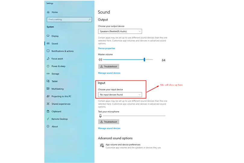 - Scroll down to the Input section to set mic properties and adjust volume.