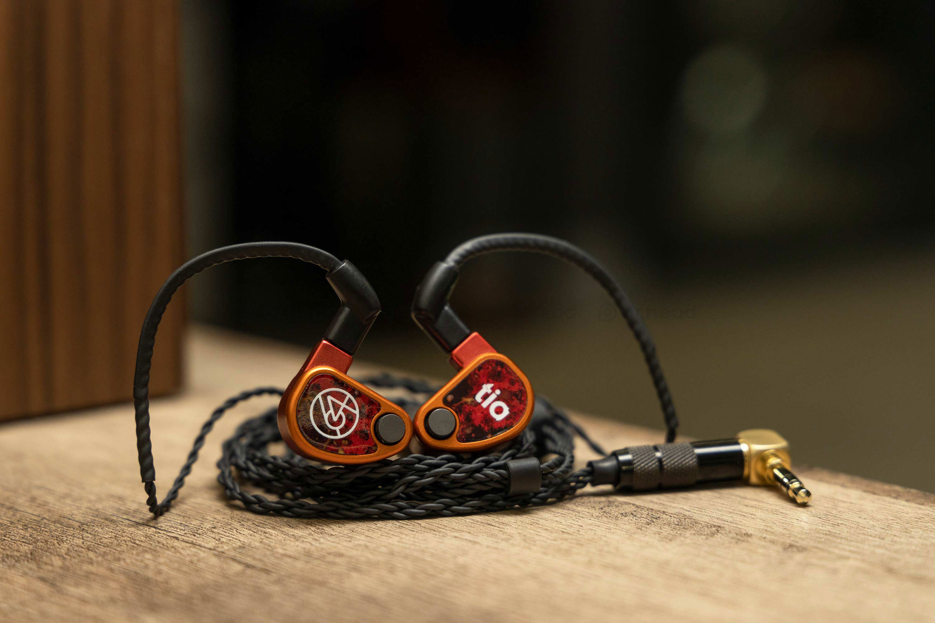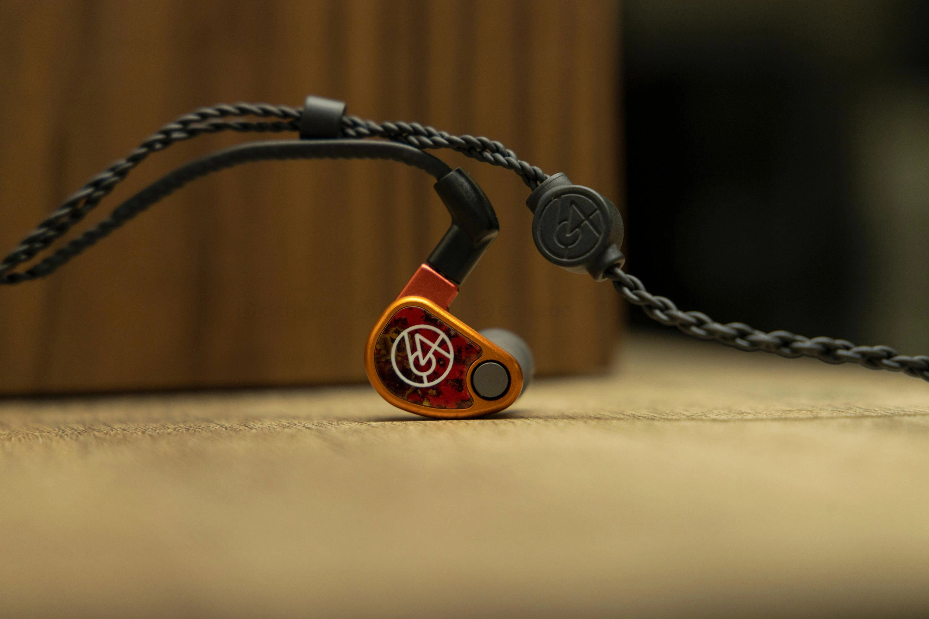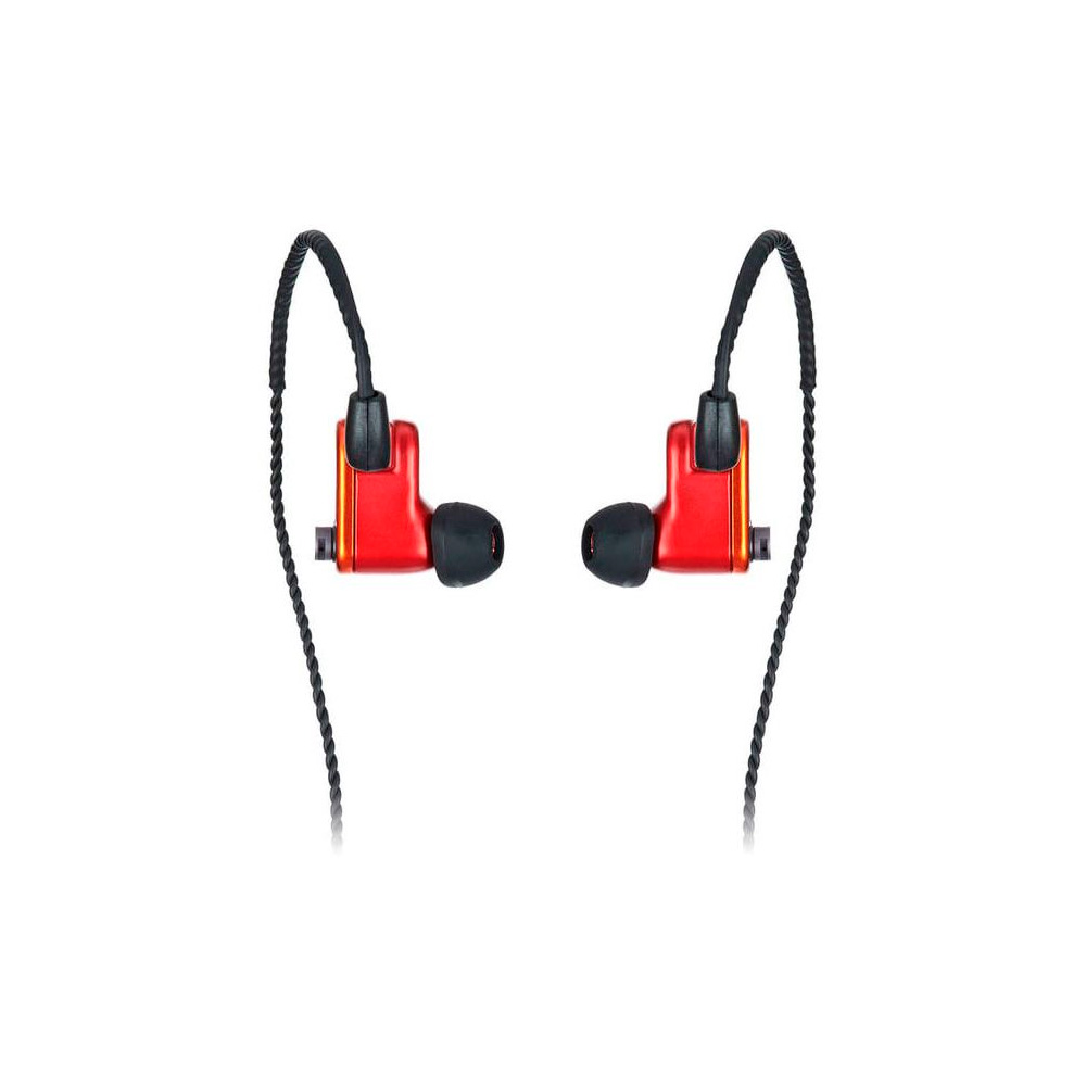 The headphone housing mimics the shape of the ear canal. It is made of a single piece of anodized red aluminum and adorned with an elegant copper patina insert on the face panels.