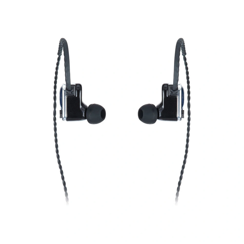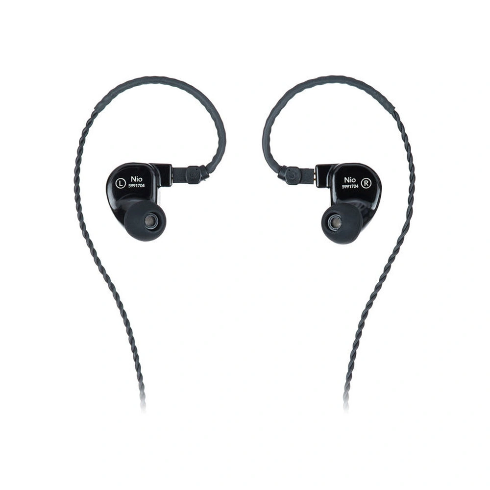 64 Audio Nio - hybrid in-ear monitors. Each monitor contains a 9mm dynamic driver and 8 balanced armature drivers. The dynamic driver handles the low frequencies, six balanced armature drivers handle the mids, one driver transitions mid to high, and one Tia driver covers the highs. A 4-way passive crossover coordinates the drivers.