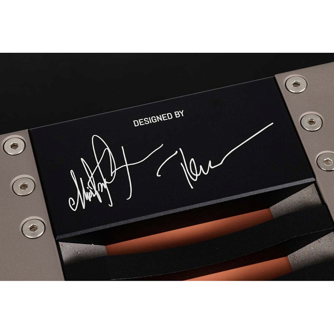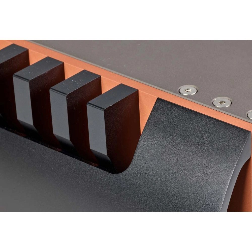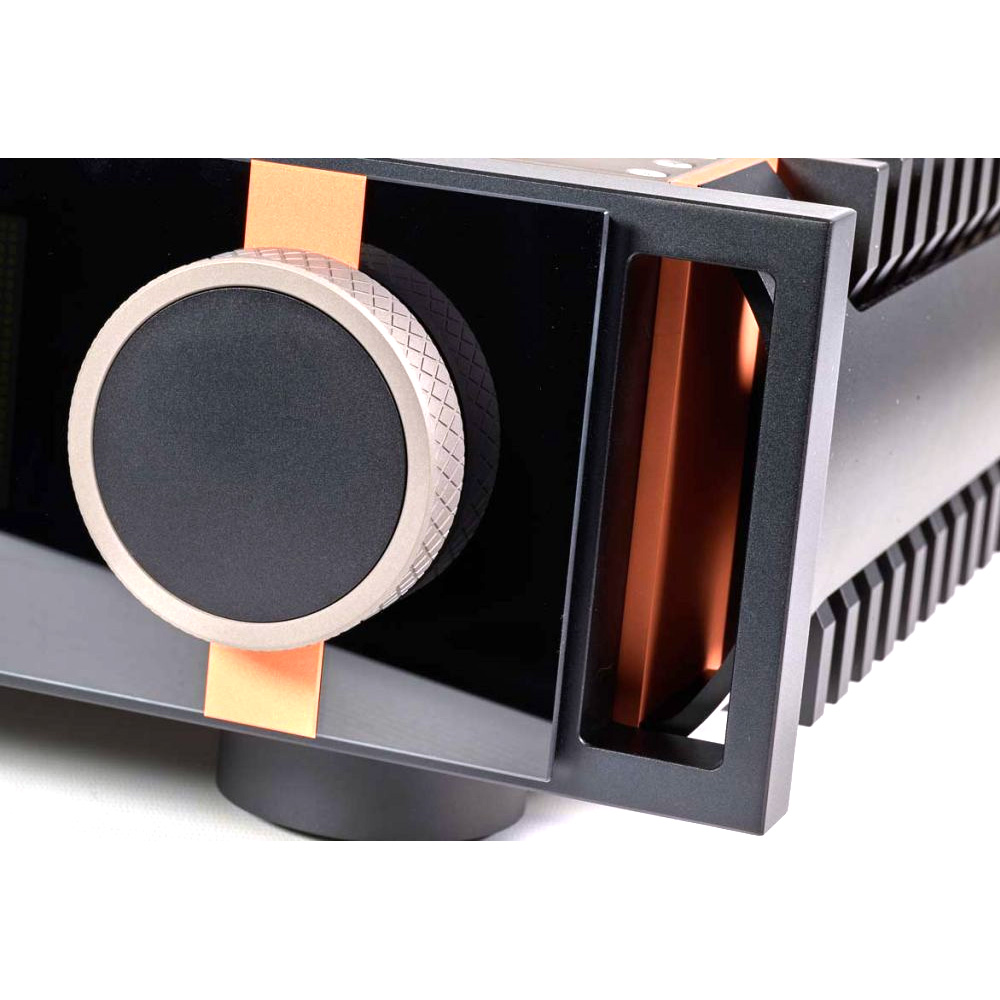 The Aavik I-880 amplifier housing was primarily designed to preserve the best sound characteristics. Copper was chosen as the main material for the housing components. The chassis is a sandwich of copper plate, heavy laminate padding, and a layer of titanium at the bottom, with copper cooling radiators mounted on the sides. The volume knob is covered with a rubber layer, and the main amplifier control functions are implemented through a large touch LCD display. Aavik 880 series amplifiers rest on included isolation supports, Ansuz Darkz Z2, further reducing hysteresis, lowering output impedance, decreasing inductance, positively impacting damping factor, and providing a calmer amplifier operation.