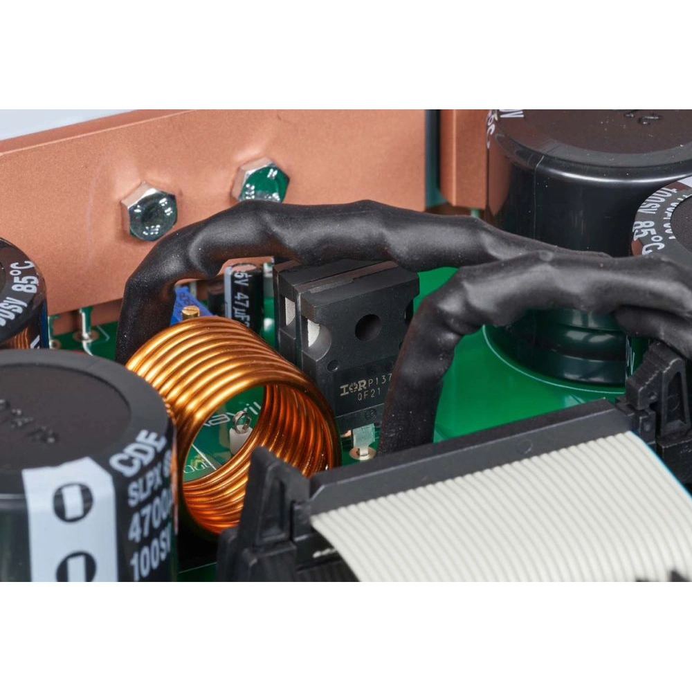The principle involves having two coils wound in each direction – one coil and a counter coil. As developers put it: "double inverted coil" – both coils carry voltage, and when a Tesla coil encounters a voltage spike, the counter spike is activated to eliminate noise. Since noise spikes are pure voltage and carry little charge, suppression is quite good, but not 100%. By adding more PTC coils in parallel, performance is increased. Thanks to this implementation, the perception of blackness in music is significantly enhanced.