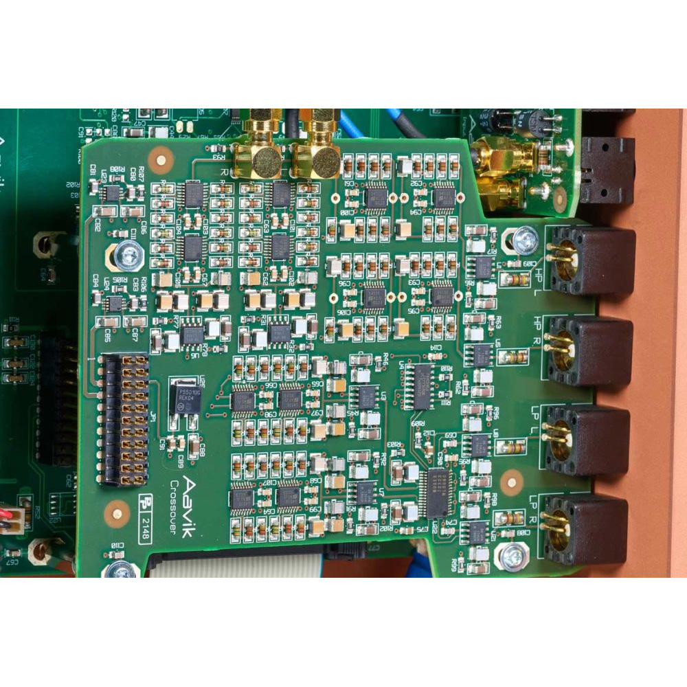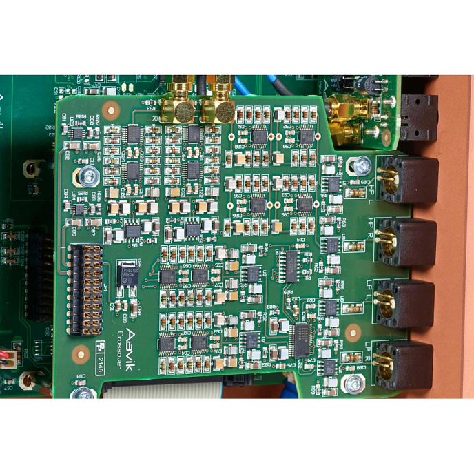 The Aavik amplifier also includes an analog crossover, allowing for precision implementation of a triphonic configuration with an active subwoofer. Additionally, this crossover can be used for analog sound system correction according to the acoustic features of the listening room. The active analog crossover ensures precise synchronization when sending audio signals to receiving components, crucial for avoiding sharp and muffled sound. The Aavik active crossover was designed for either very precise subwoofer control or with an integrated low- and high-pass filter for managing a 2.1 home theater system.