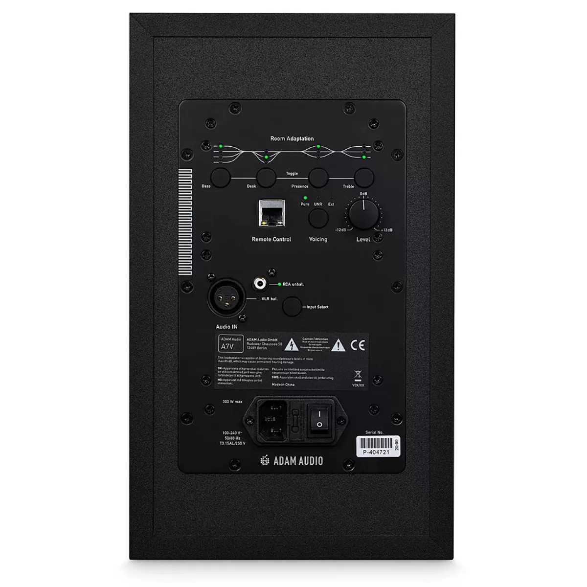 On the back panel of the speaker, there are four adjustment ranges for room adaptation: low frequencies, desks, high presence frequencies. Each range is adjusted in pre-set steps, offering over 100 tuning options to help compensate for typical acoustical problems when placing speakers.