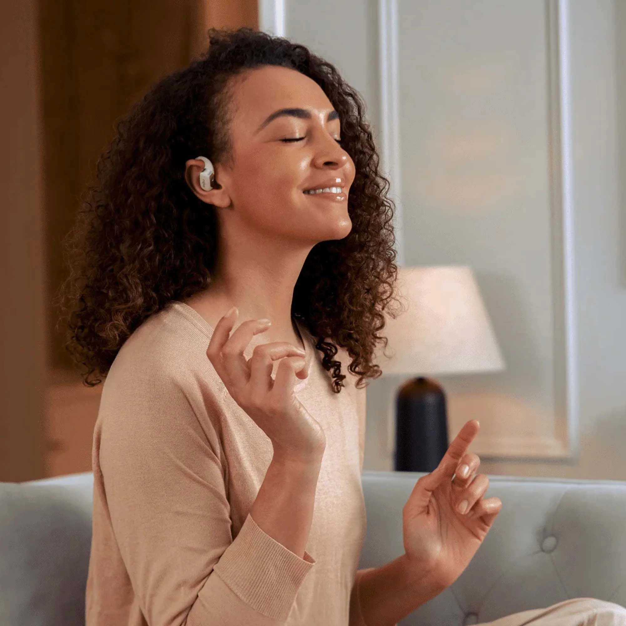 Shokz OpenFit headphones feature built-in noise-canceling technology during phone calls, allowing for use in open spaces not only for listening to music but also for conversations. During a call, OpenFit captures the nuances of the human voice even in noisy environments by placing dual microphones in the best position to create the most effective adaptive beamforming for noise cancellation.