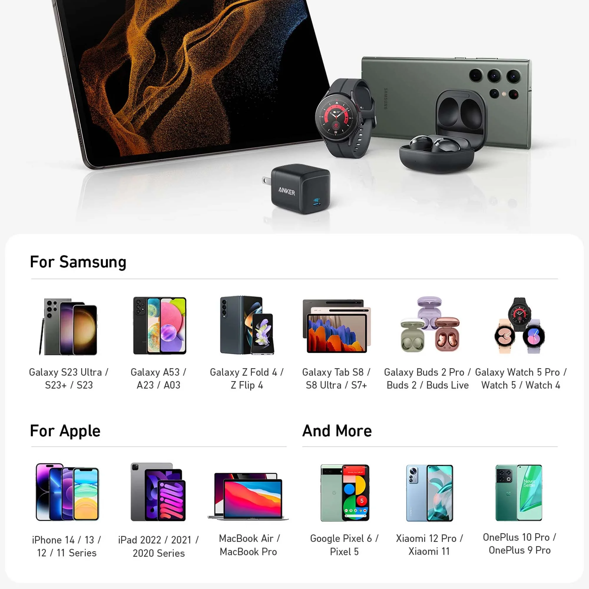 The charger is specifically designed to work with Samsung Galaxy devices, including the mentioned models. However, it may also work with other USB-C devices, as long as they support the required charging standards and power profiles.