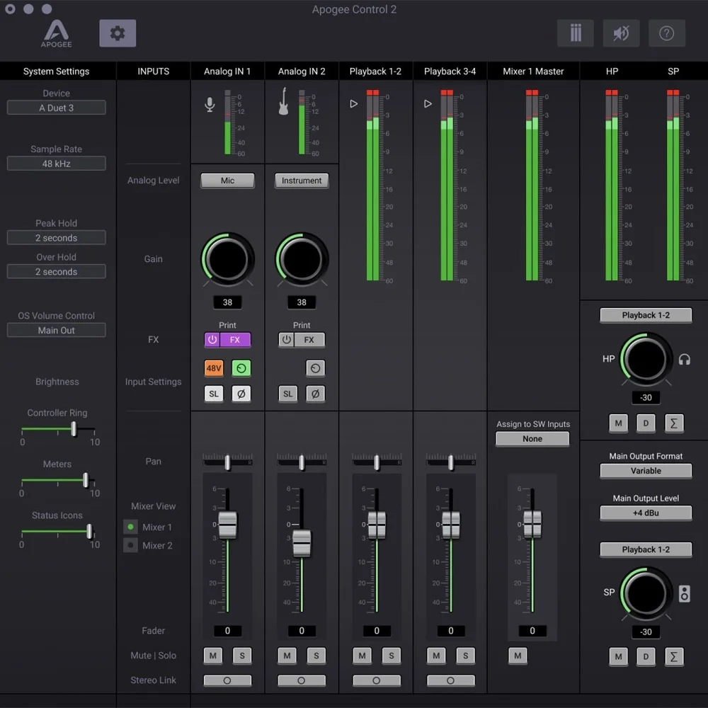 The Apogee Duet 3 includes the signature Apogee Control 2 software, which gives you full access to all the features and capabilities of the Duet, including the Symphony ECS Channel Strip FX, running on the Duet's hardware DSP. Apogee Control 2 is used for all previous generation Apogee products and will allow Apogee support service and engineers to quickly respond to future MacOS and Windows updates, helping ensure Duet 3 compatibility on your workstation.