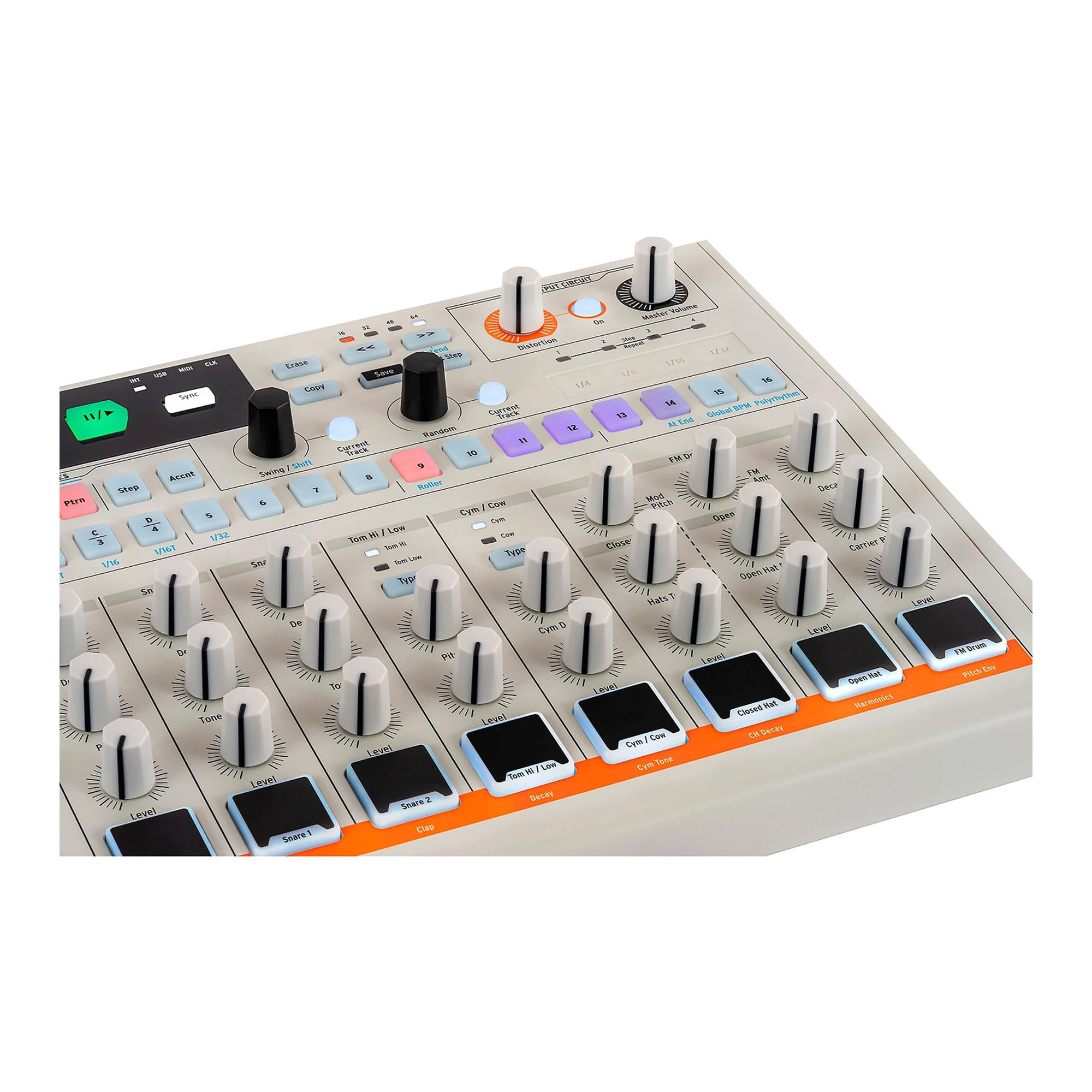 The device features 10 high-quality drum tones, including a kick drum, two snares, open and closed hi-hats, two toms, a cymbal, and a cowbell. It also includes an FM-Drum section for creating sounds based on FM synthesis. Parameters for editing tones such as pitch, tone color, decay time, and others are available. The tones are triggered by 8 backlit pads with touch sensitivity, and there is a powerful polyrhythmic sequencer with 64 patterns of 64 steps each. Effects for patterns include Swing, accentuating weak beats, Random for random dynamic changes, and Step Repeat for looping a sequence section down to a single beat. The Color mode can be applied to entire patterns or individual hits, significantly altering the sound to make it more powerful and louder. Lastly, the audio signal can be processed through the built-in distortion instead of the Steiner-Parker filter from the original version.