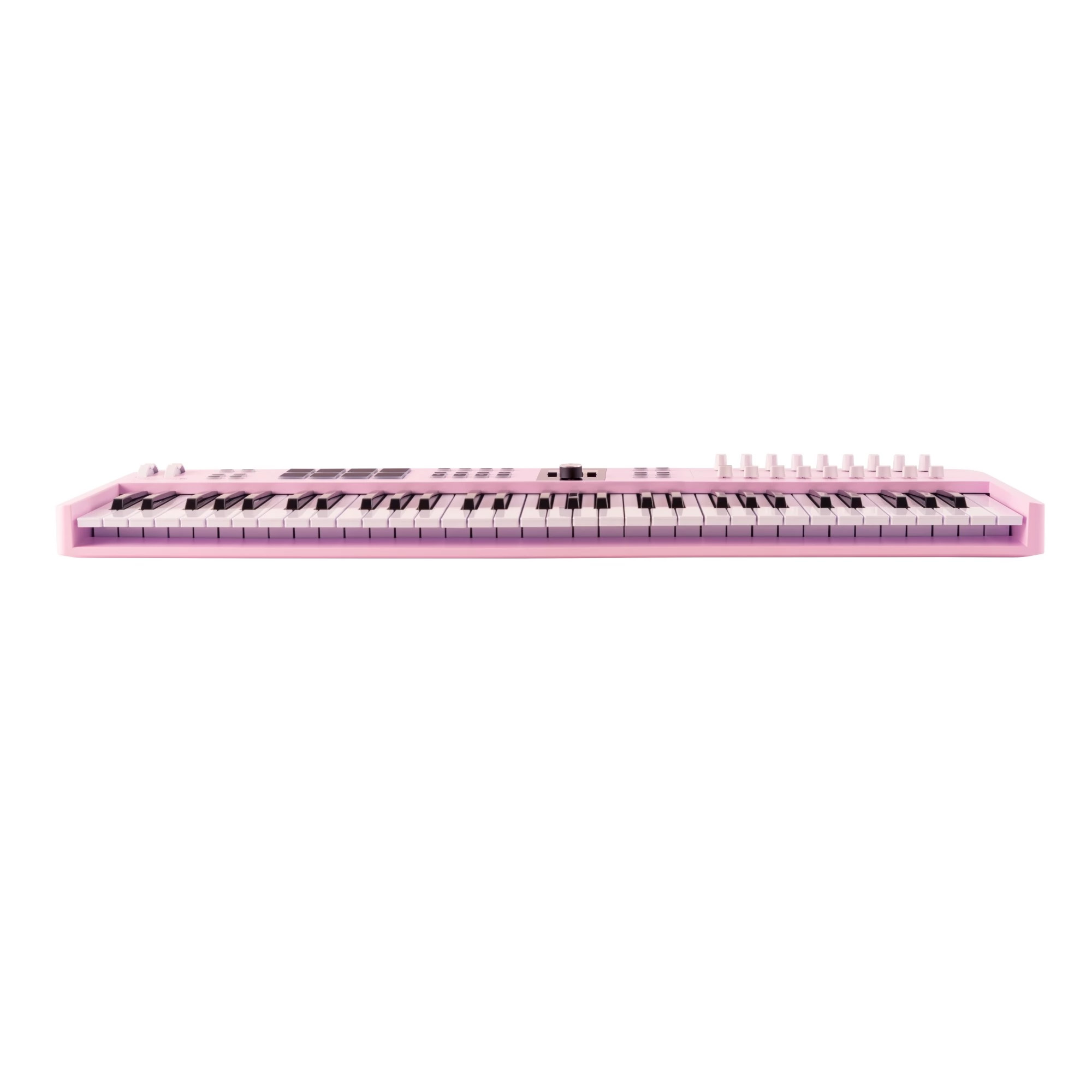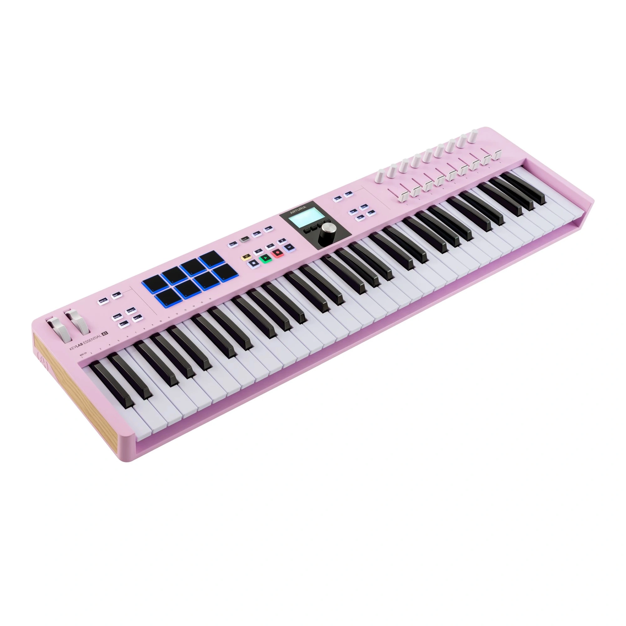 On the left side of the controller, there are 8 KeyLab Essential pads with RGB backlighting, allowing users to assign samples to them, launch clips, and assign any other functions. The pads are also pressure-sensitive. Next, there are illuminated DAW transport control buttons, allowing switching between recording mode or sequenced playback. On the right side of the device, there are 9 assignable encoders and 9 faders. They can be used to control parameters of virtual synthesizers, adjust volume levels, and envelope parameters.