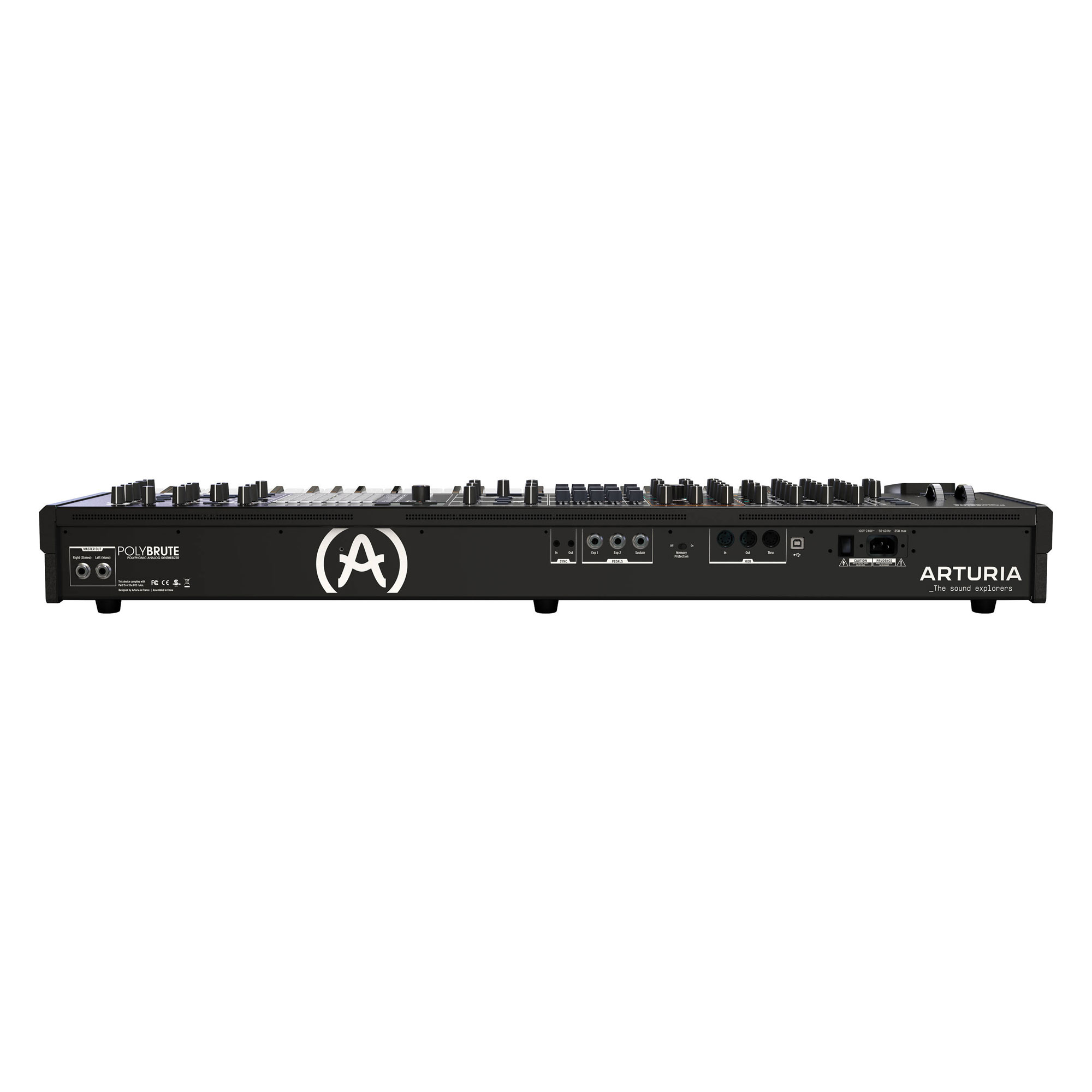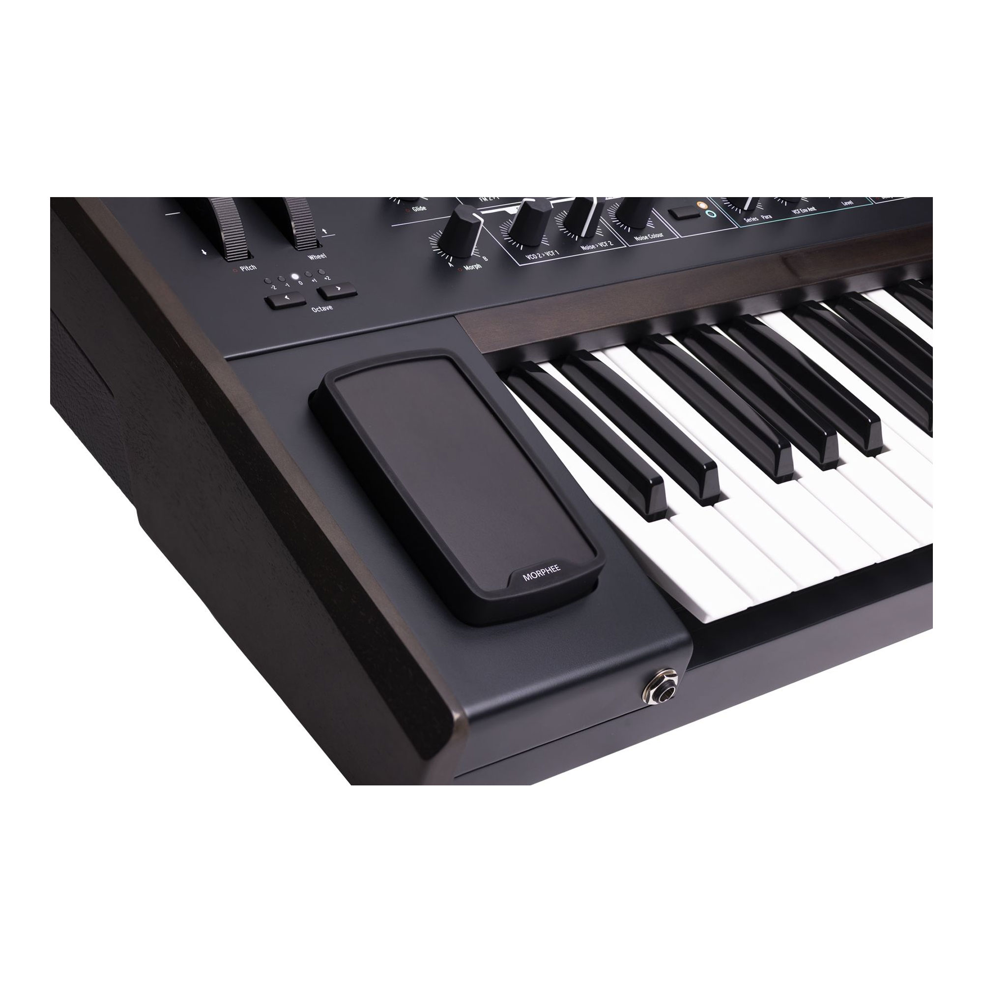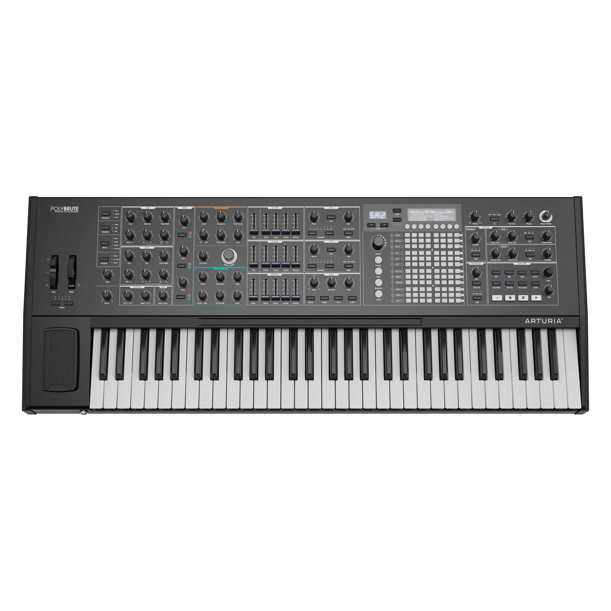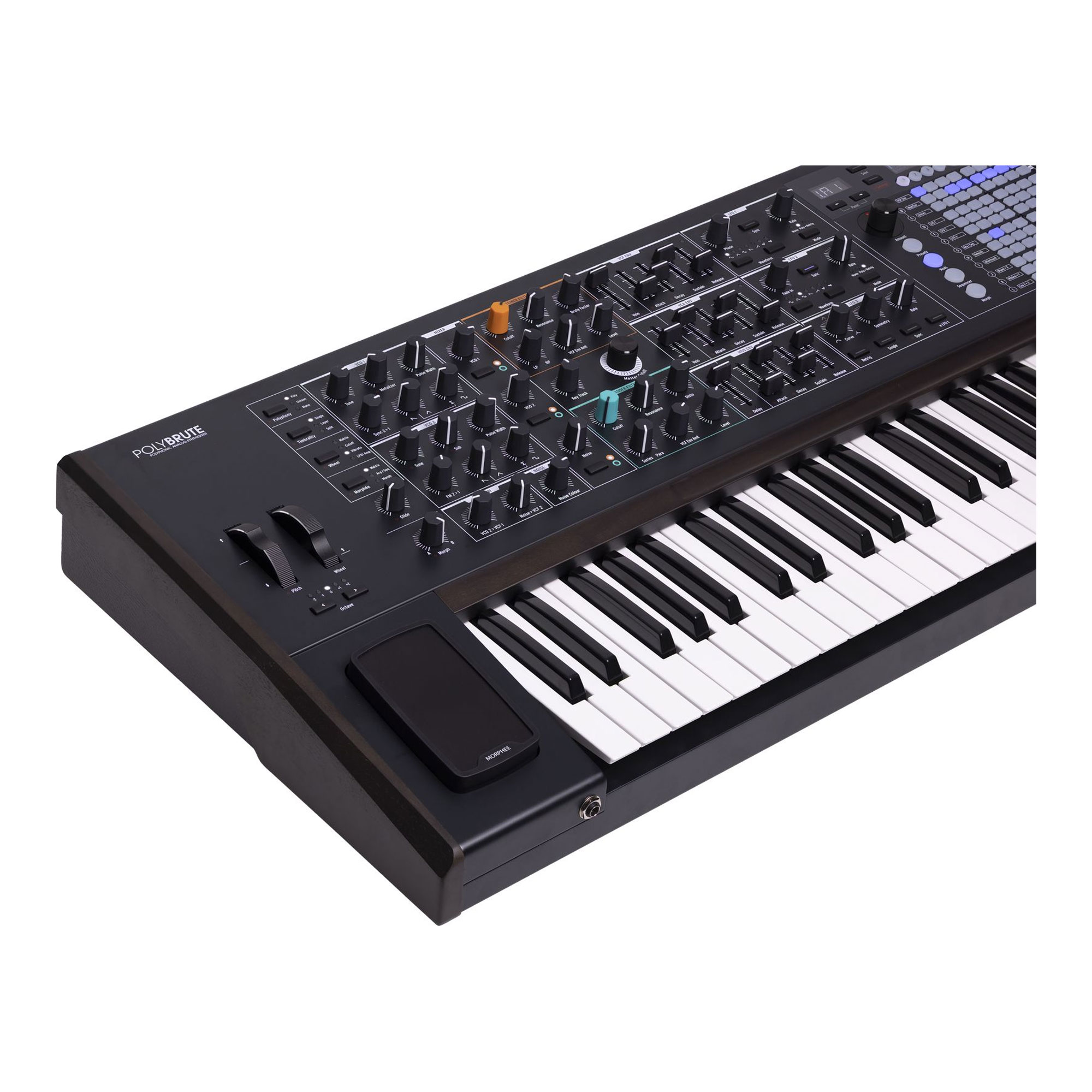 The Arturia Polybrute is a polyphonic analog synthesizer with a 61-key velocity-sensitive keyboard with aftertouch. The model features a large number of control elements, including an OLED display, a ribbon controller, and a unique three-dimensional Morphee XYZ controller made of black walnut wood. The PolyBrute is built around the concept of sound morphing.