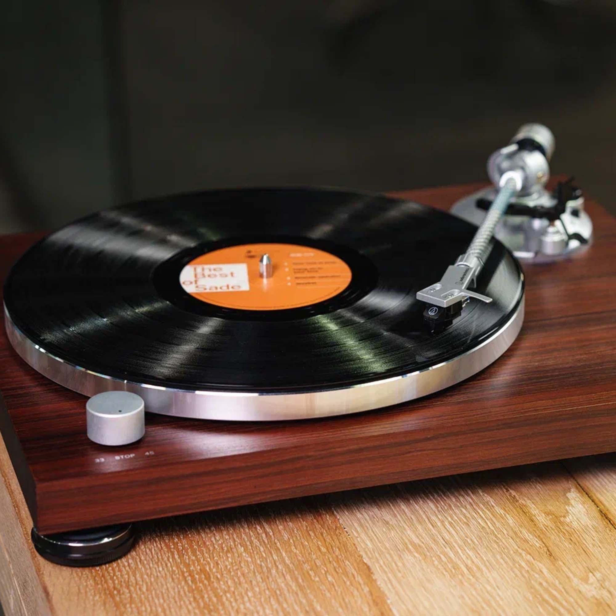 This turntable features a 30mm thick MDF anti-resonance platter with a rosewood veneer finish to dampen low-frequency acoustic feedback, as well as a motor with a sensor to ensure accurate rotation speeds of 33-1/3 and 45 RPM. It also includes a professional anti-resonance die-cast aluminum platter with a rubber mat.