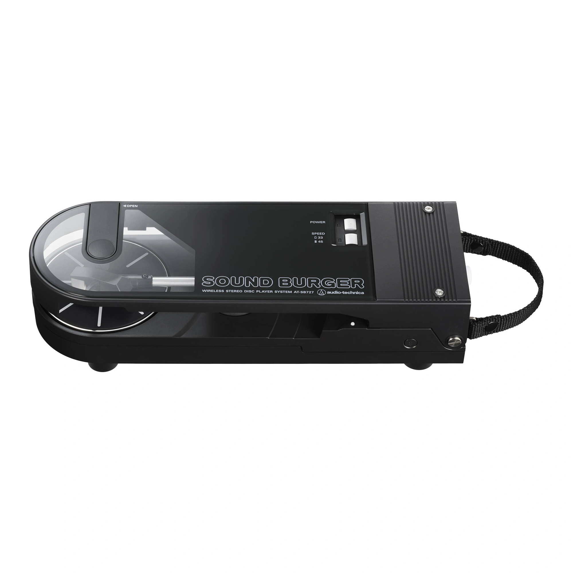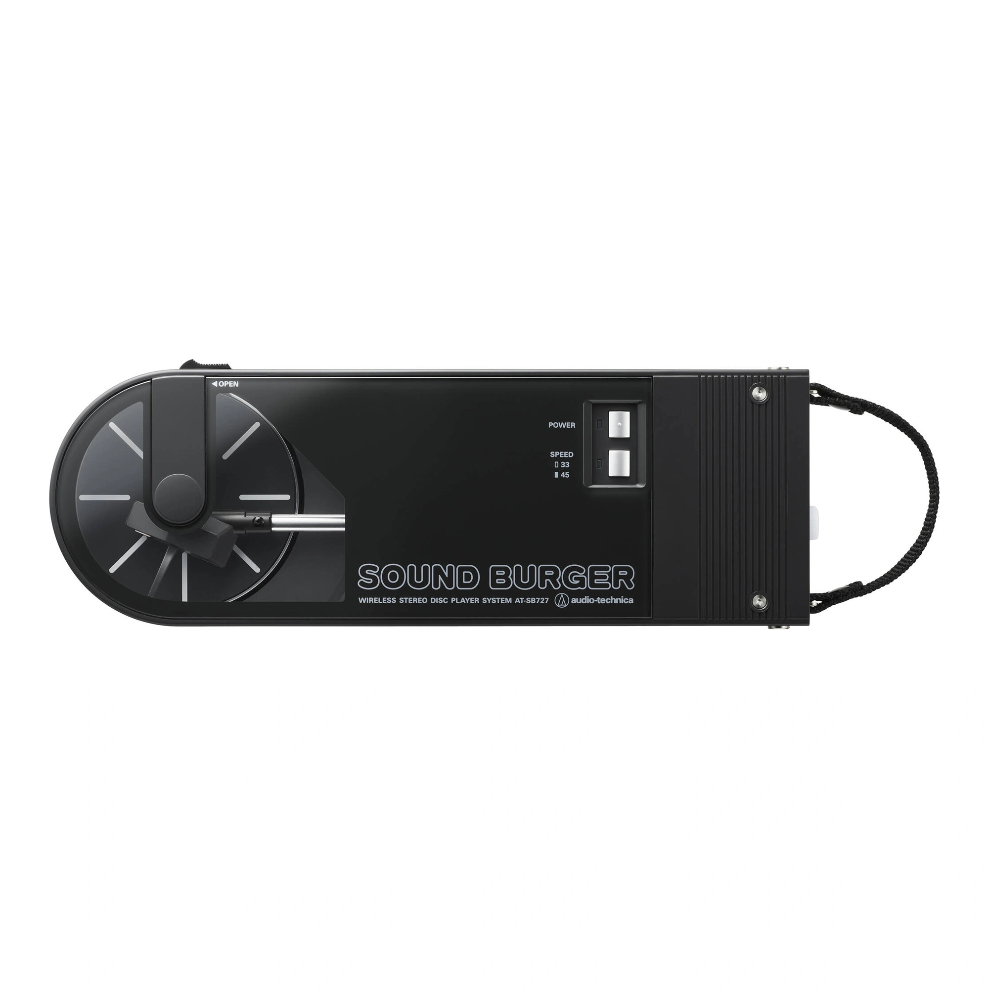 To achieve the sound of a standard Audio-Technica turntable, the Sound Burger has been equipped with a diecast aluminum alloy platter with audio damping, a high-precision, belt-driven DC motor, special tonearm system, and replaceable ATN3600L stylus. The DC motor is made to deliver stable and accurate rotation, while the tonearm employs a dynamic balance system. This system ensures smooth playback by applying the necessary stylus pressure through a spring.