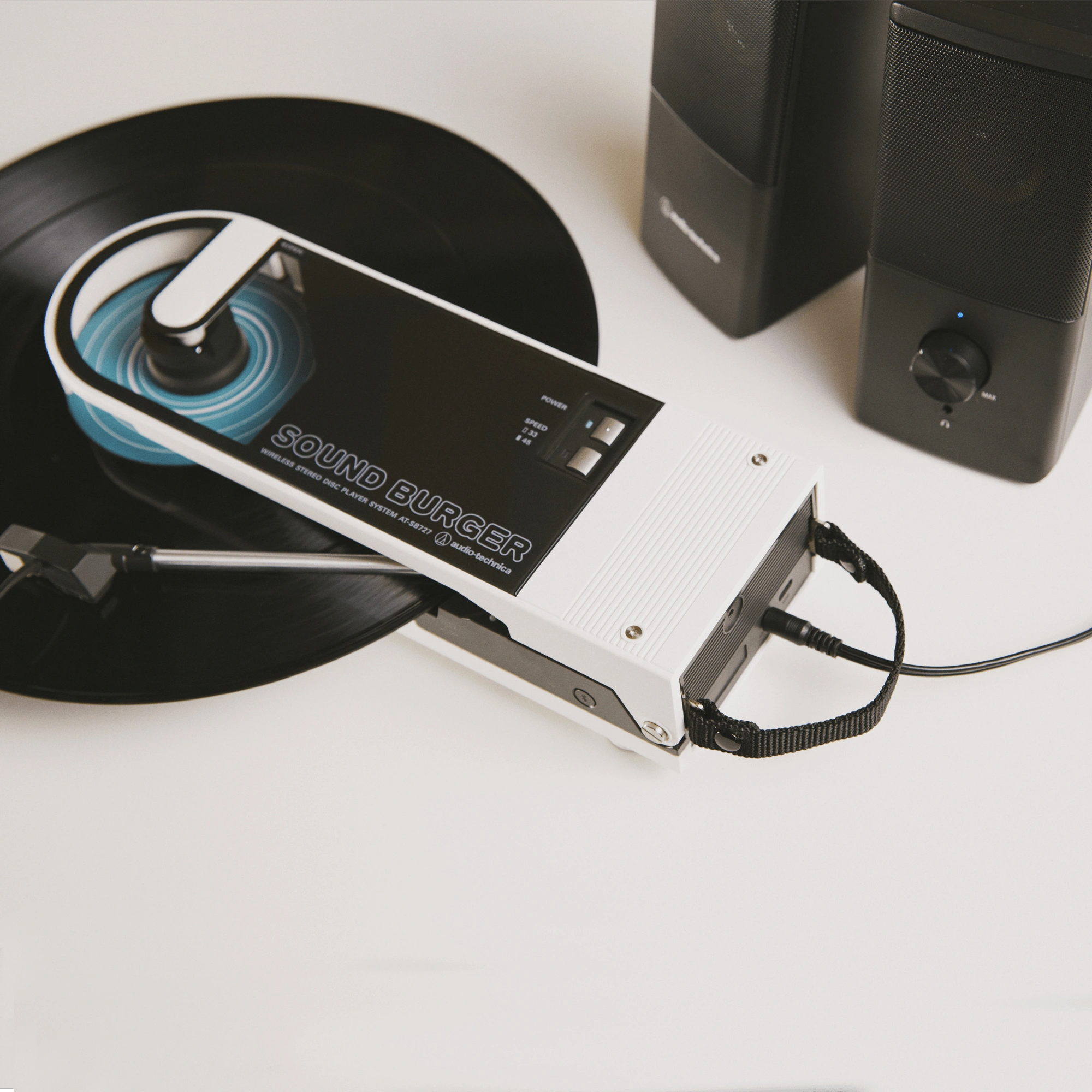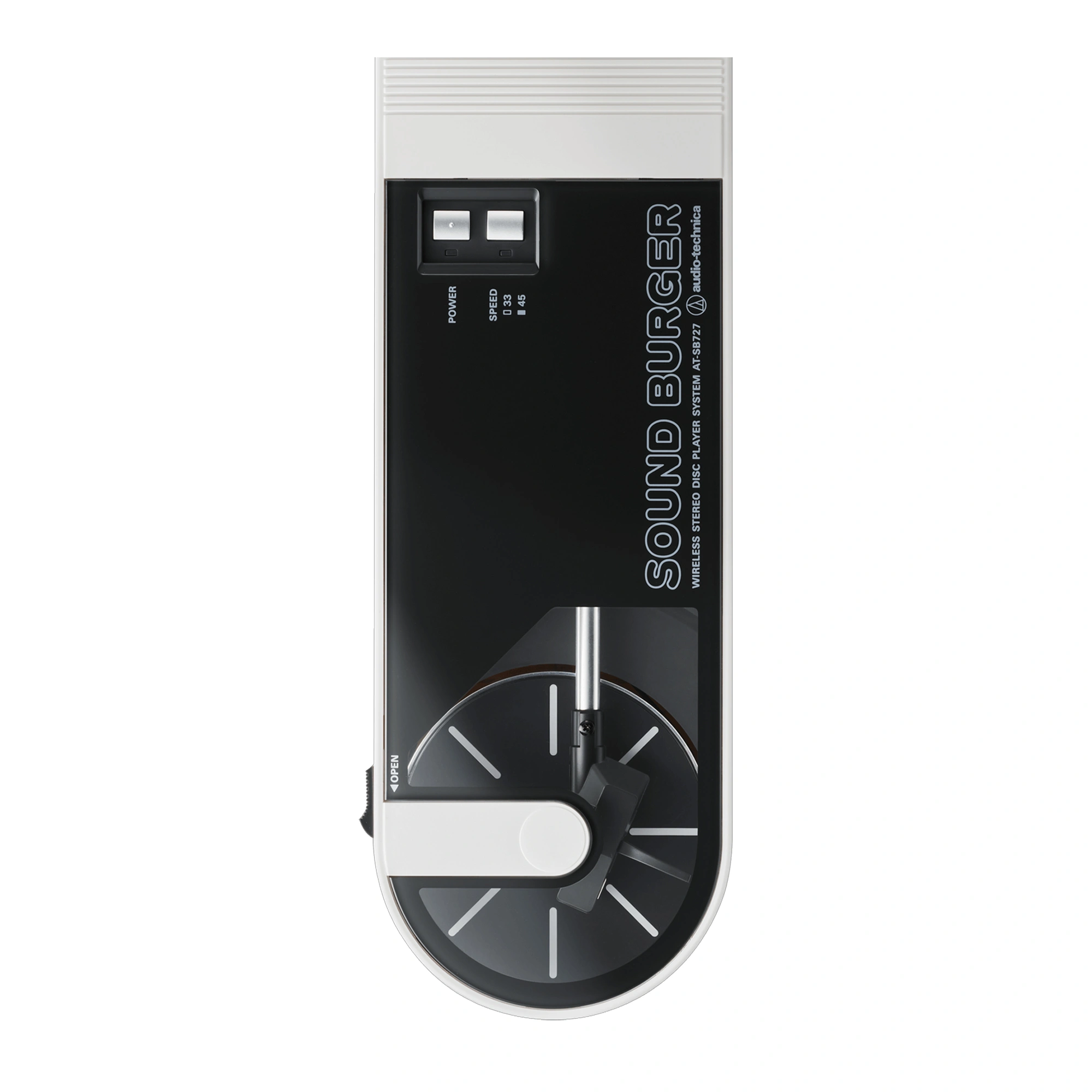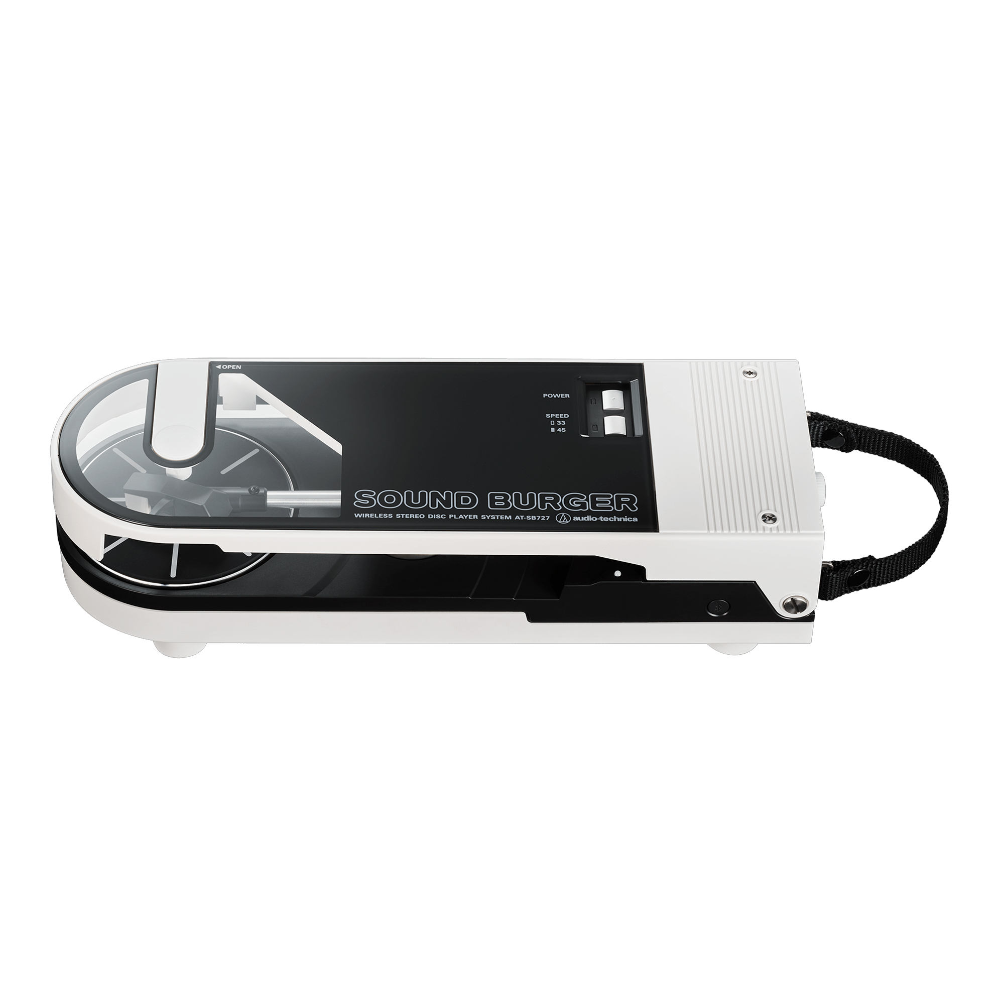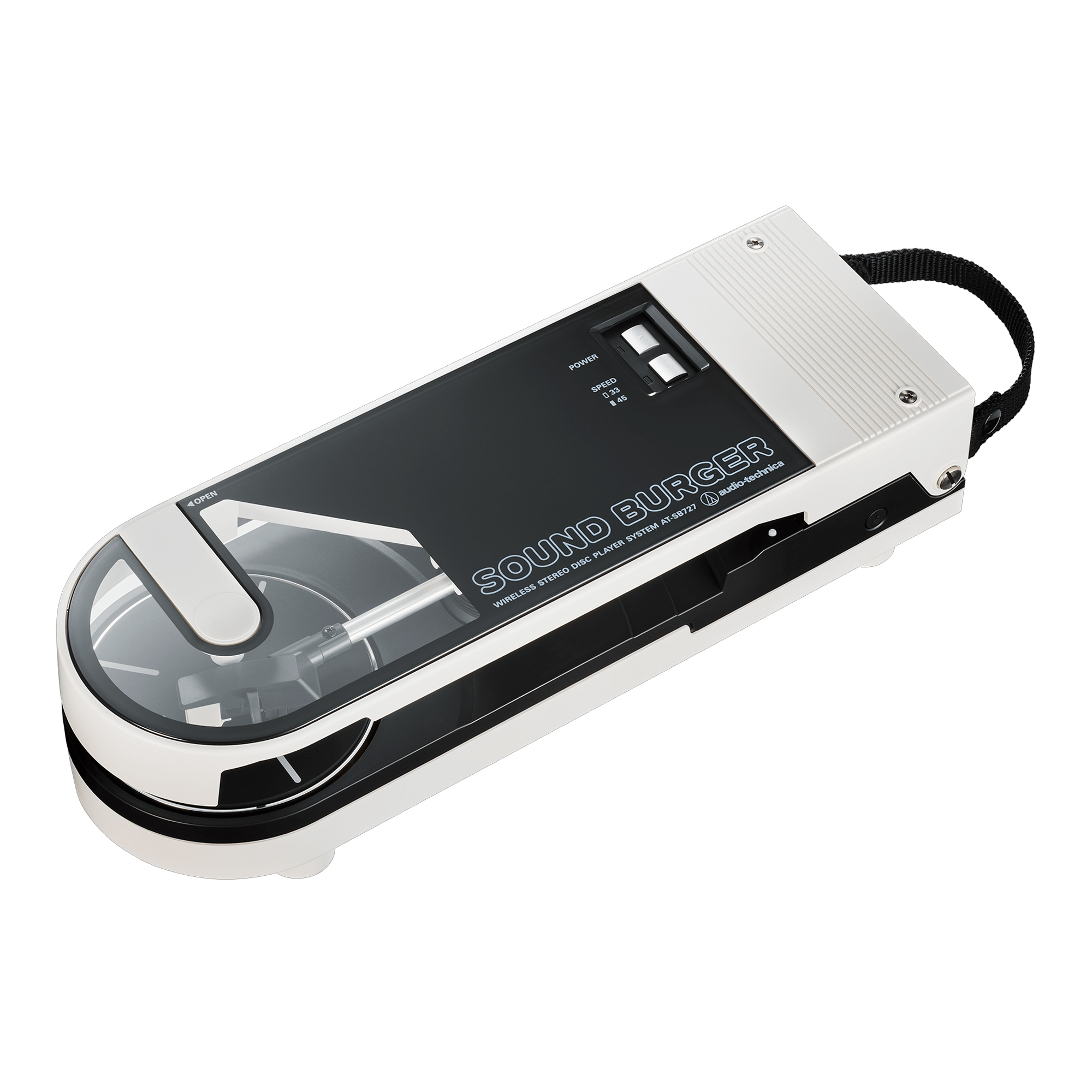 To achieve the sound of a standard Audio-Technica turntable, the Sound Burger has been equipped with a diecast aluminum alloy platter with audio damping, a high-precision, belt-driven DC motor, special tonearm system, and replaceable ATN3600L stylus. The DC motor is made to deliver stable and accurate rotation, while the tonearm employs a dynamic balance system. This system ensures smooth playback by applying the necessary stylus pressure through a spring.