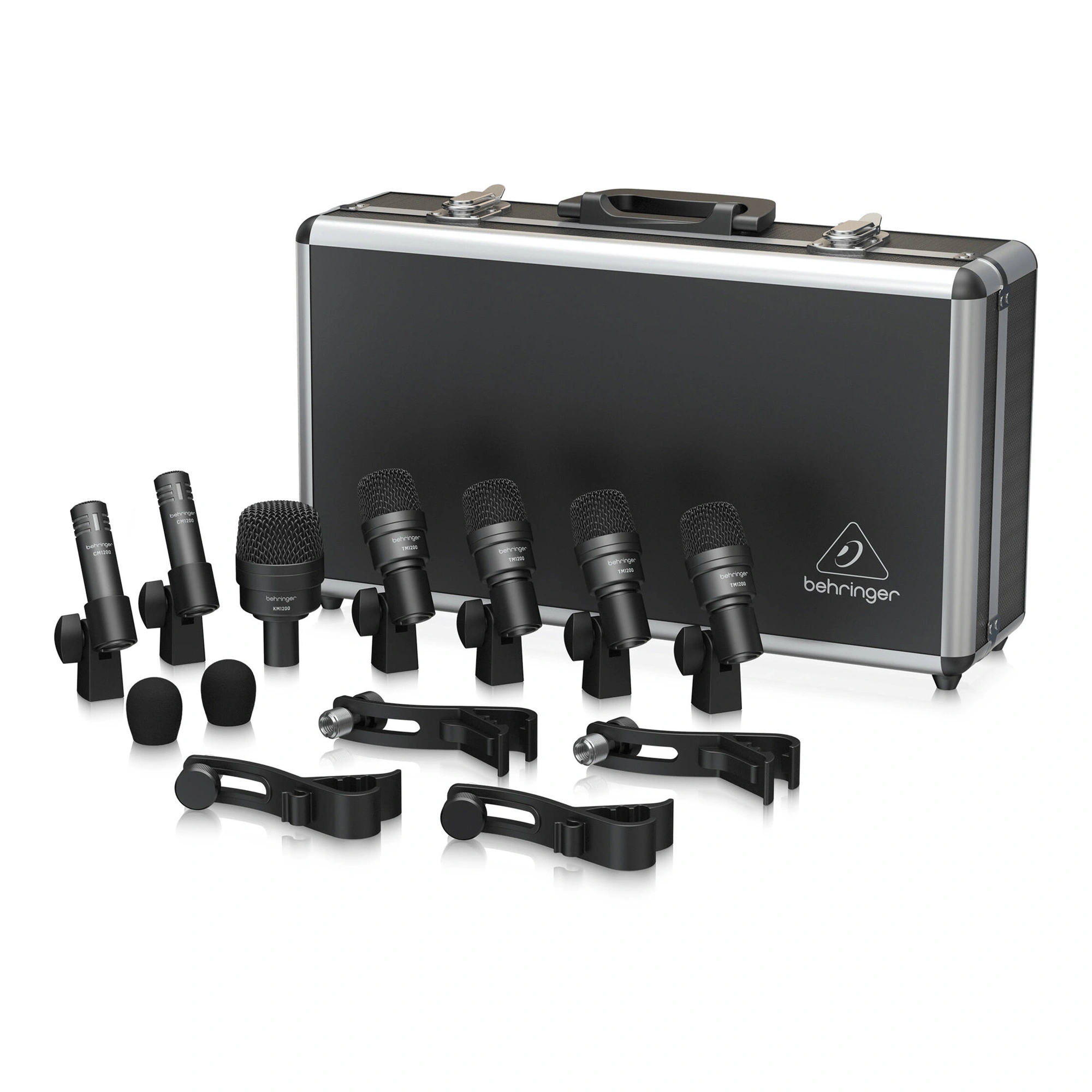 The BC1200 set includes three types of microphones specifically designed for different elements of the drum kit. The KM1200 is a large diaphragm dynamic microphone for the bass drum, providing powerful low-frequency sound with a frequency range of 50 Hz - 14 kHz. Four TM1200 microphones with medium diaphragms are intended for toms and snare drum, with a frequency range of 70 Hz - 14 kHz. Two CM1200 condenser microphones with a frequency range of 70 Hz - 18 kHz are perfect for recording cymbals and serving as overheads.