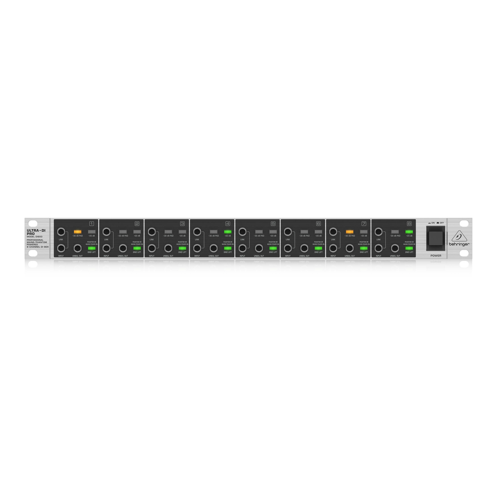 - Level Controls: Each of the 8 outputs has its own level control and 5-segment LED indicator.