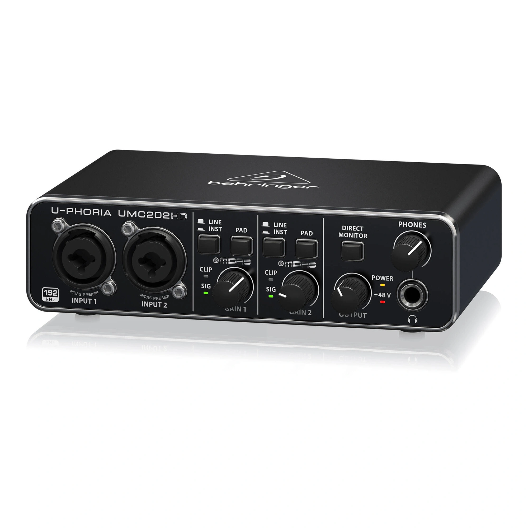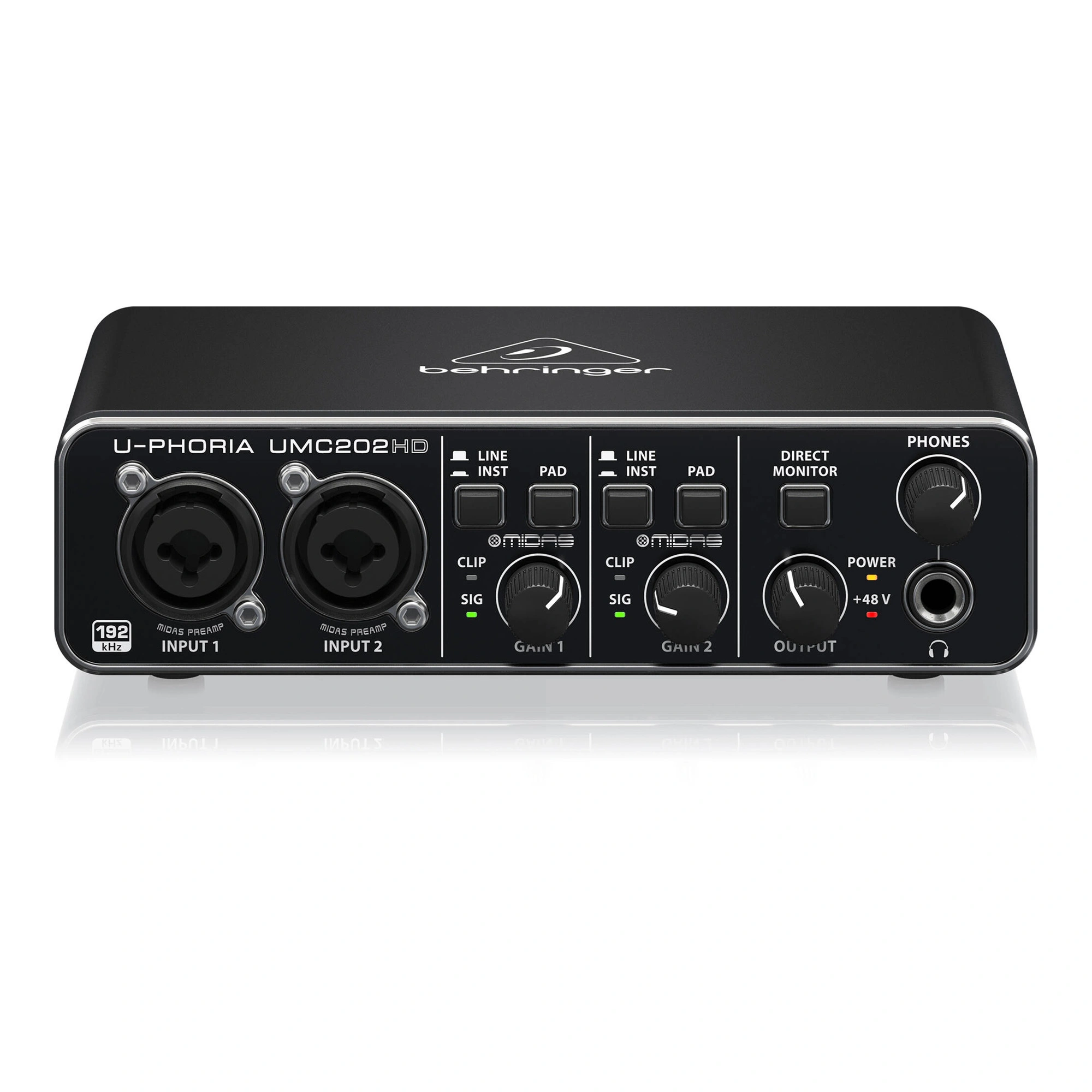 Enjoy low-latency monitoring and convenient home recording with the UMC202HD from Behringer, a 2x2 USB audio interface that provides up to 192 kHz sampling at 24 bits. With two combo XLR-1/4" inputs with high-quality Midas preamps, you can reproduce detailed sound from various audio sources including microphones, line signals, and high-quality instruments. Control features include individual input gain adjustment for each channel, output gain adjustment, choice of line or high-level input signal, input panel activation, and the ability to select 48V phantom power for condenser microphones. You can monitor your headphones with zero latency using the Direct Monitor button. The front panel features LED indicators for input signal, power, clip, and phantom power. This interface is housed in a durable metal casing and will stand the test of time.