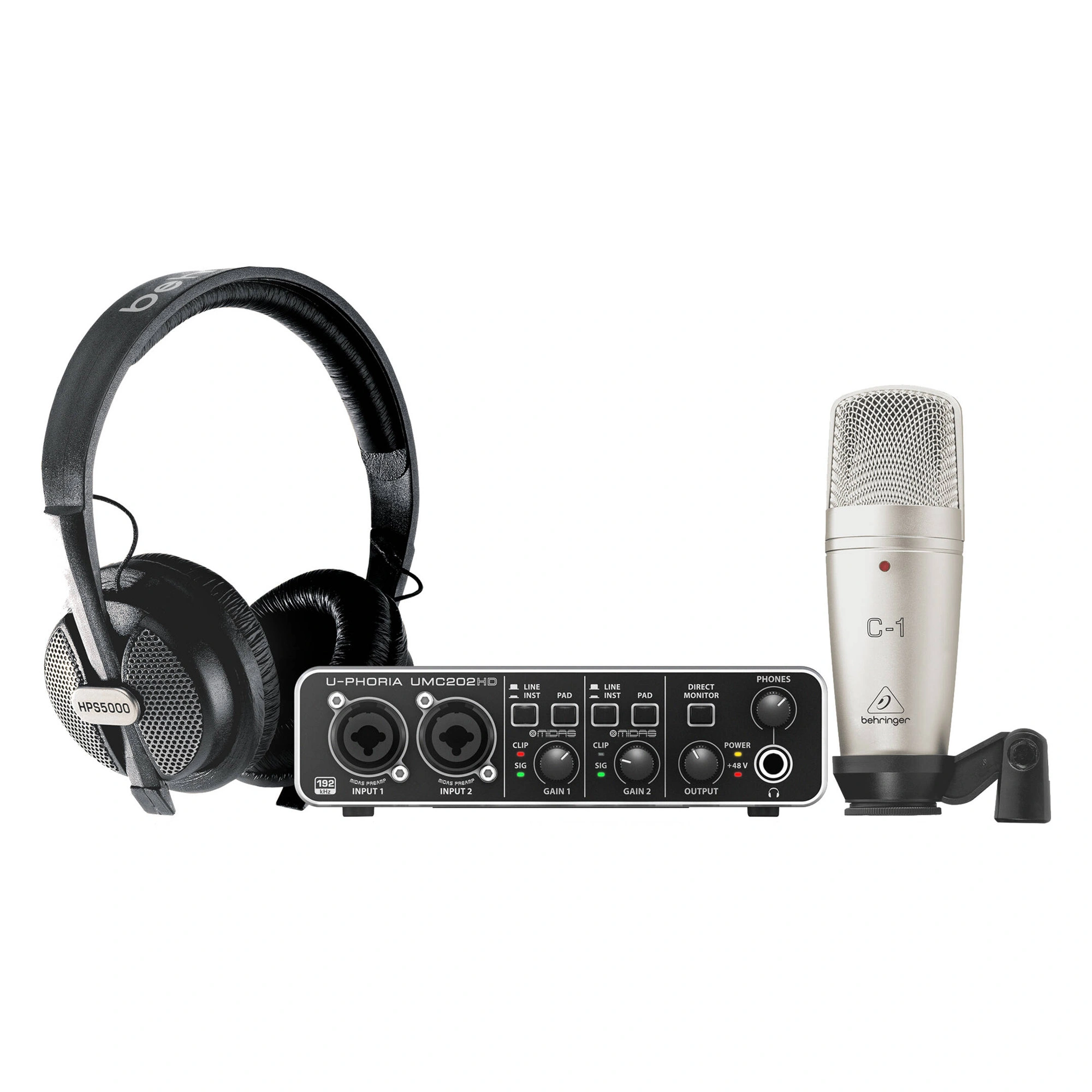 Instantly create a complete home recording and podcasting system with the U-Phoria Studio Pro kit from Behringer, which combines the UMC202HD 2x2 USB audio interface with the large-diaphragm C-1 condenser microphone, HPS5000 studio headphones, a swivel stand, XLR and USB cables.