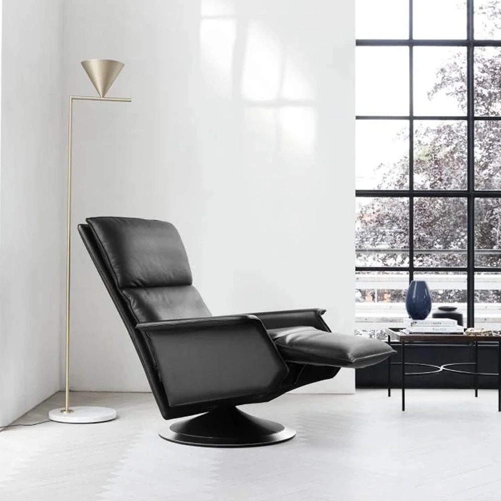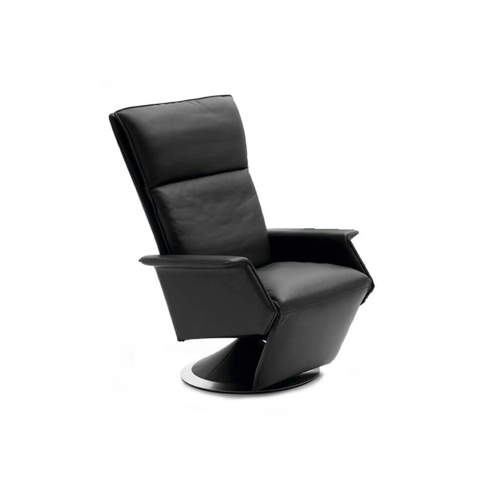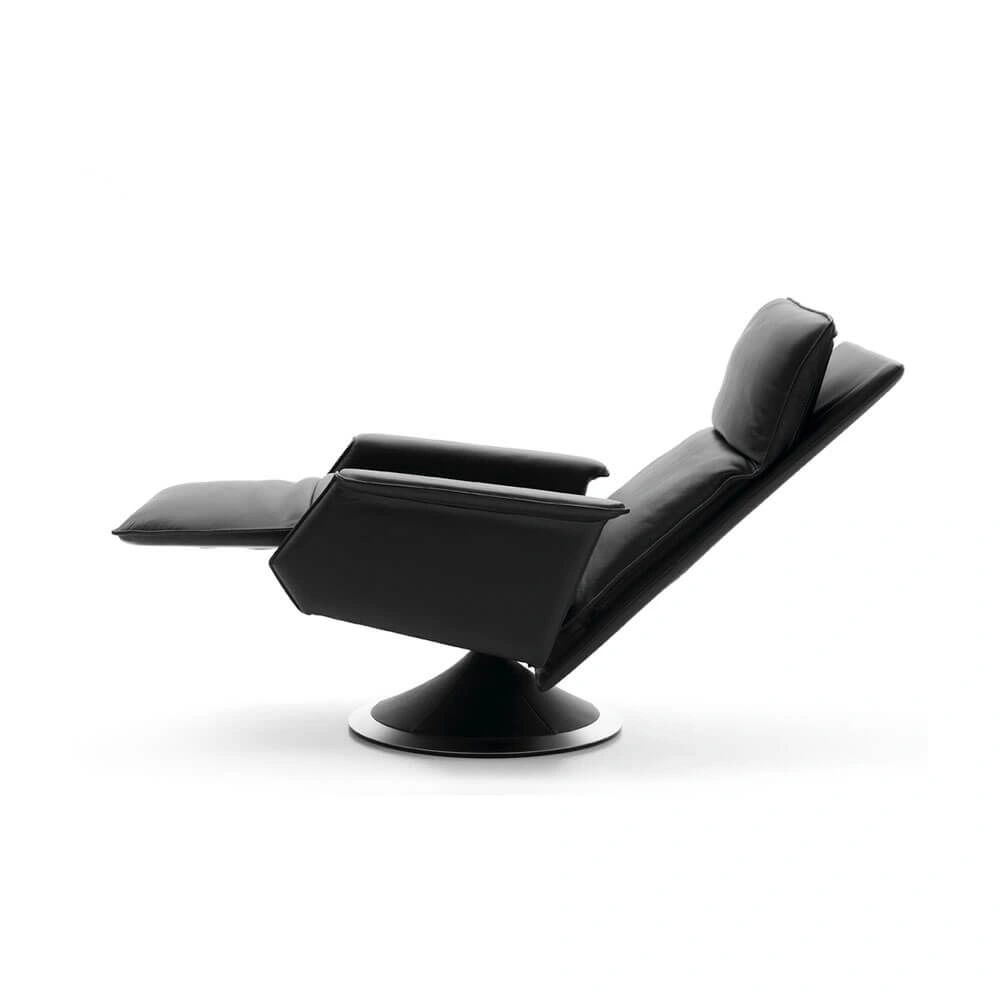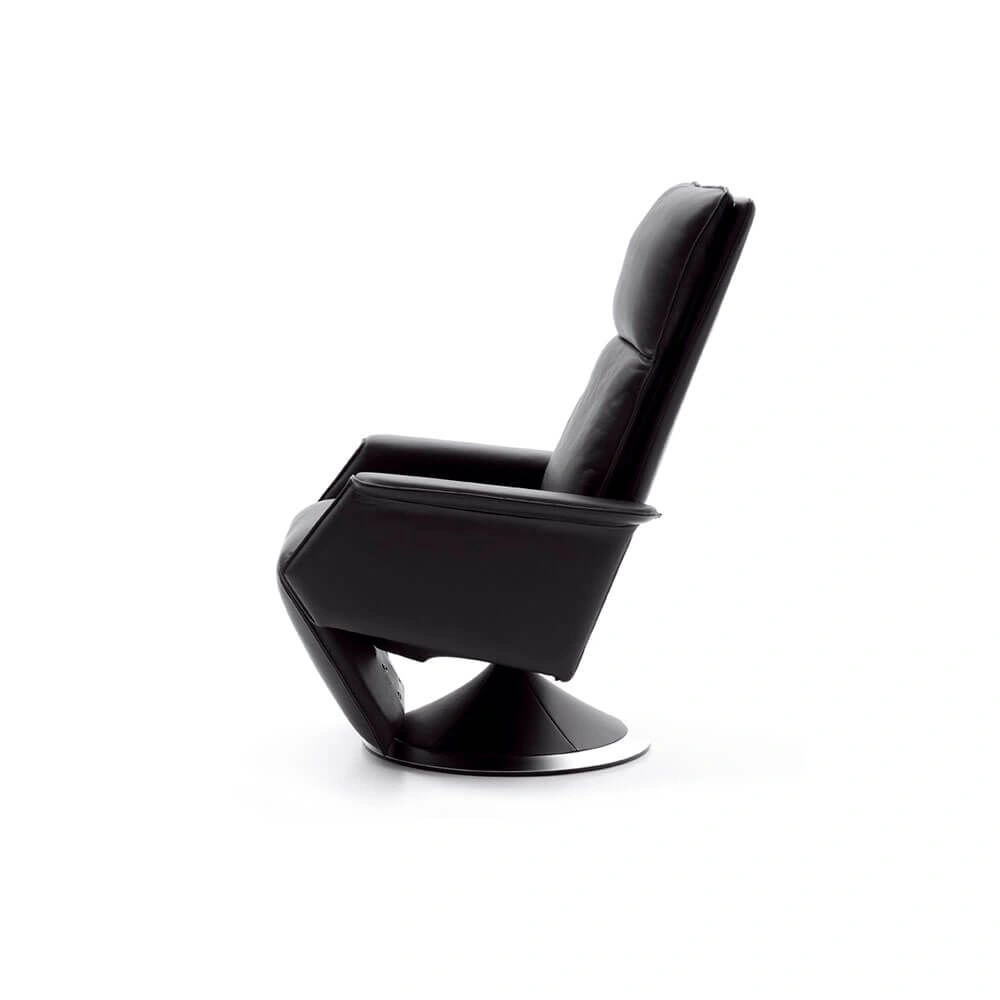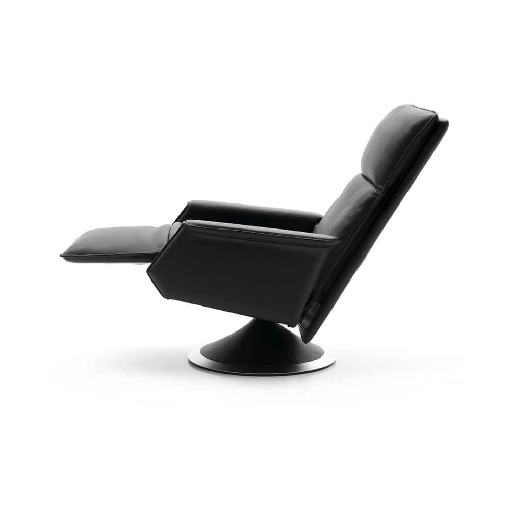 Classic elegance and timeless design give Ceto and Ato character. A light push on the armrests when seated, and the footrest automatically lifts up and extends by 15 cm on Ceto and 12 cm on Ato. This unique function provides full support under the legs and calves. When activating the mechanism hidden under the right armrest, the backrest slides backwards and downwards and relieves the pressure on both back and lumbar region. The backrest can be locked in any position, and the headrest can be adjusted separately. The seat and back have foam padding for optimum support and pressure relief. In addition, the back cushion is channelled and, as a special feature, filled with the finest down to give the user an experience out of the ordinary. To put it modestly, a world original. An exclusive detail for Berg Furniture which confirms our philosophy of Comfort in design. The ring on the base is available in 10 types of wood or in matt/shiny chrome.