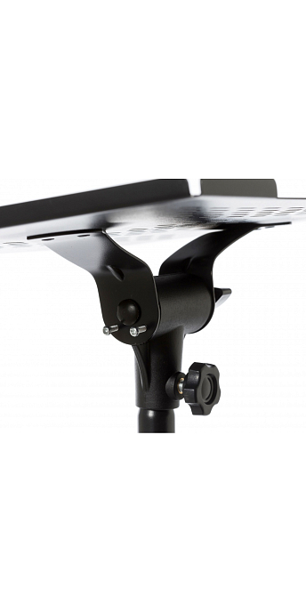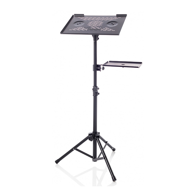 Bespeco LPS100 is a stand for a laptop, projector, or other devices, equipped with a side shelf for additional items. This model is adjustable in height and tilt, allowing you to securely position your devices at the desired level.