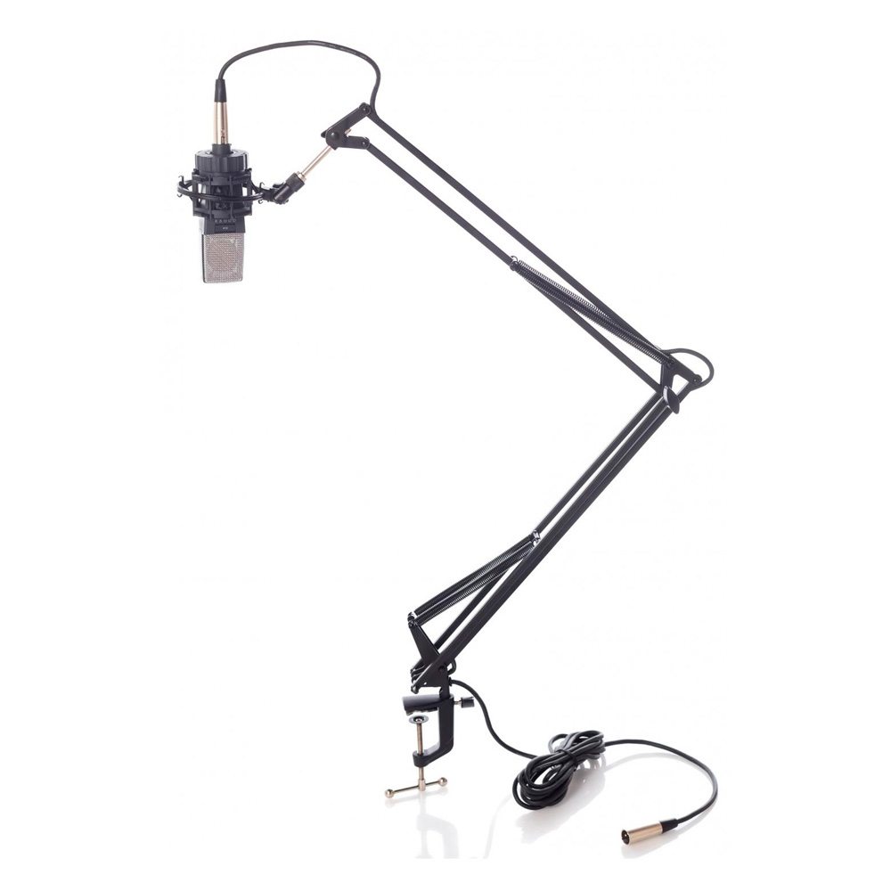 Bespeco MSRA10 is a professional microphone boom arm stand designed for use in home settings or broadcasting studios. This model features a sturdy and flexible folding construction with a maximum height of 100 cm. The stand can support up to 1.8 kg and is made of steel, equipped with a clamp for attaching to a table surface up to 5.5 cm wide. It comes with a microphone cable with XLR connectors and a threaded adapter.
