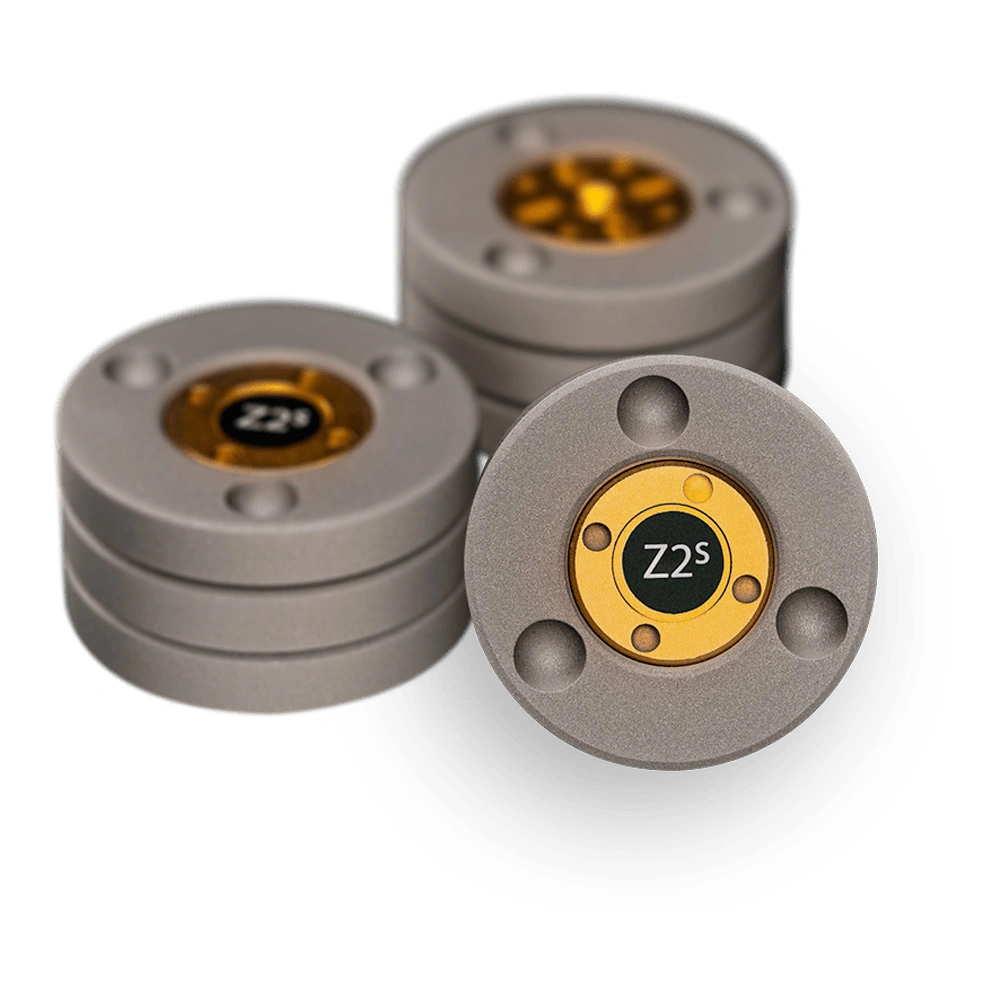 Three Ansuz Darkz Z2S resonance control decouplers are almost invisibly placed between the speaker and the top plate. The Darkz Z2S is made of zirconium and represents the flagship version among the resonance control decouplers.