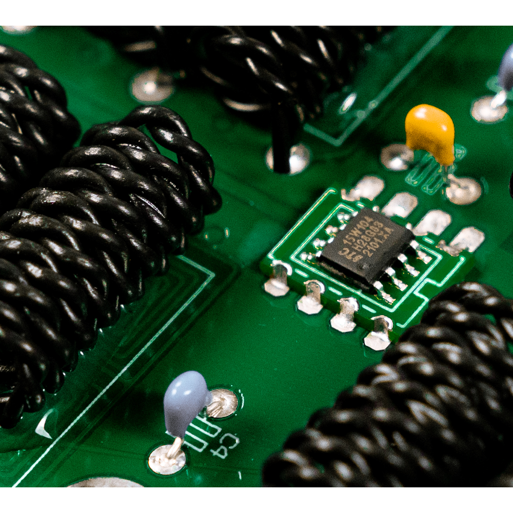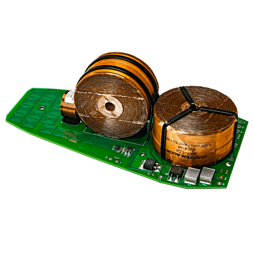 The active square Tesla coils are embedded in our circuitry boards – one coil on the top and the counter coil on the rear side. The principle is exactly the same as the active Tesla coil and thus a great ability to eliminate noise than the passive Tesla coils.