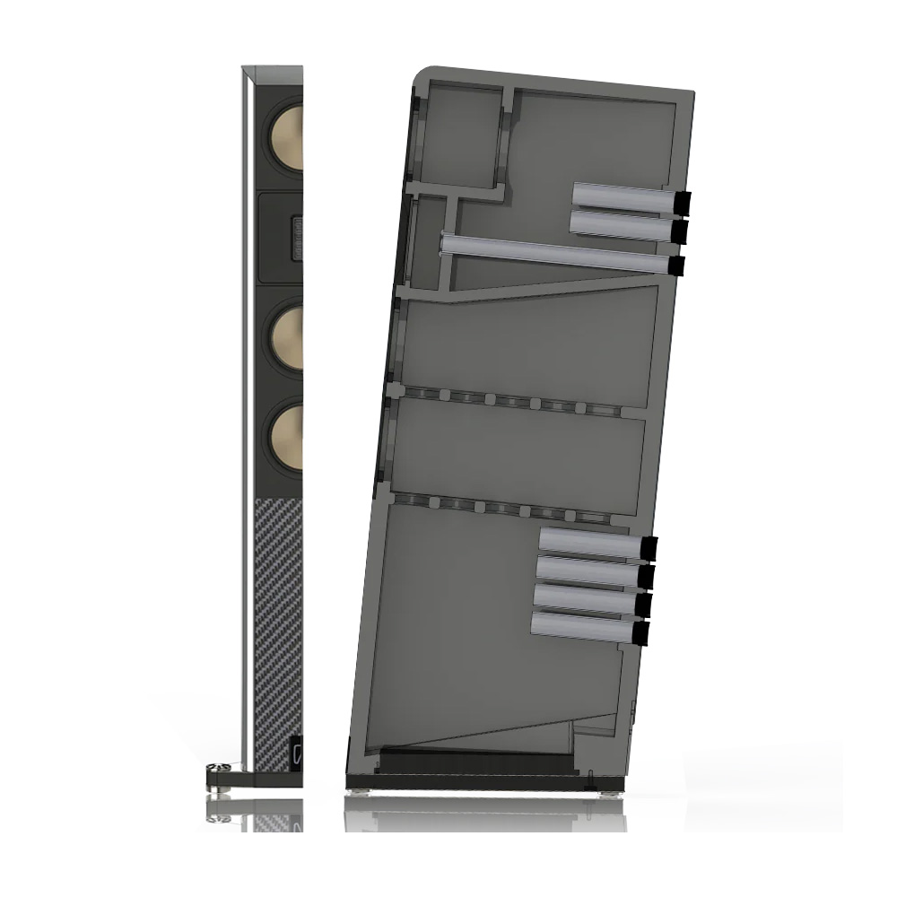 The surface of the new X6 acoustic system enclosure is covered with elegant black or white grand piano lacquer and reinforced with optical carbon fiber inserts. The enclosure itself is made of a wood composite material with reinforced braces, which eliminates sound distortions. The material used for the enclosure also reduces mechanical impacts, especially hysteresis. The acoustic result is evident. The Borresen X6 enclosure has six bass reflex ports. The tweeter compensates for the resulting air pressure. The bass section consists of tuned ports calibrated for musically significant frequencies.