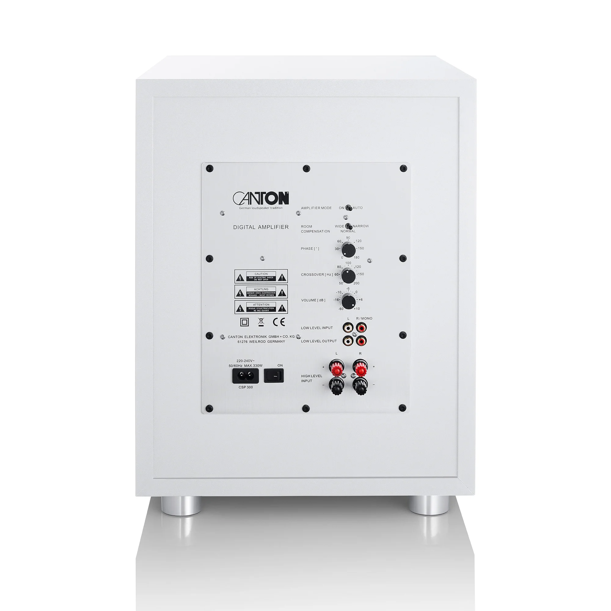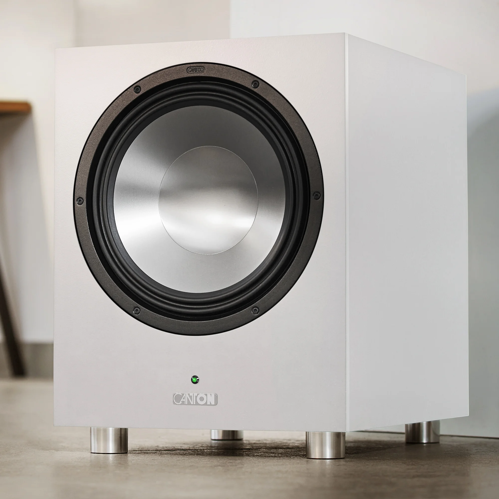 The Canton Power Sub 12 active subwoofer operates on the principle of a phase inverter with a down-firing passive membrane. To guarantee precise mechanical characteristics, it is equipped with a drive of large dimensions, including the latest generation wave processing technology. The multilayer wave volume sound provides a much greater throw compared to conventional volume sound and reduces sound distortion.