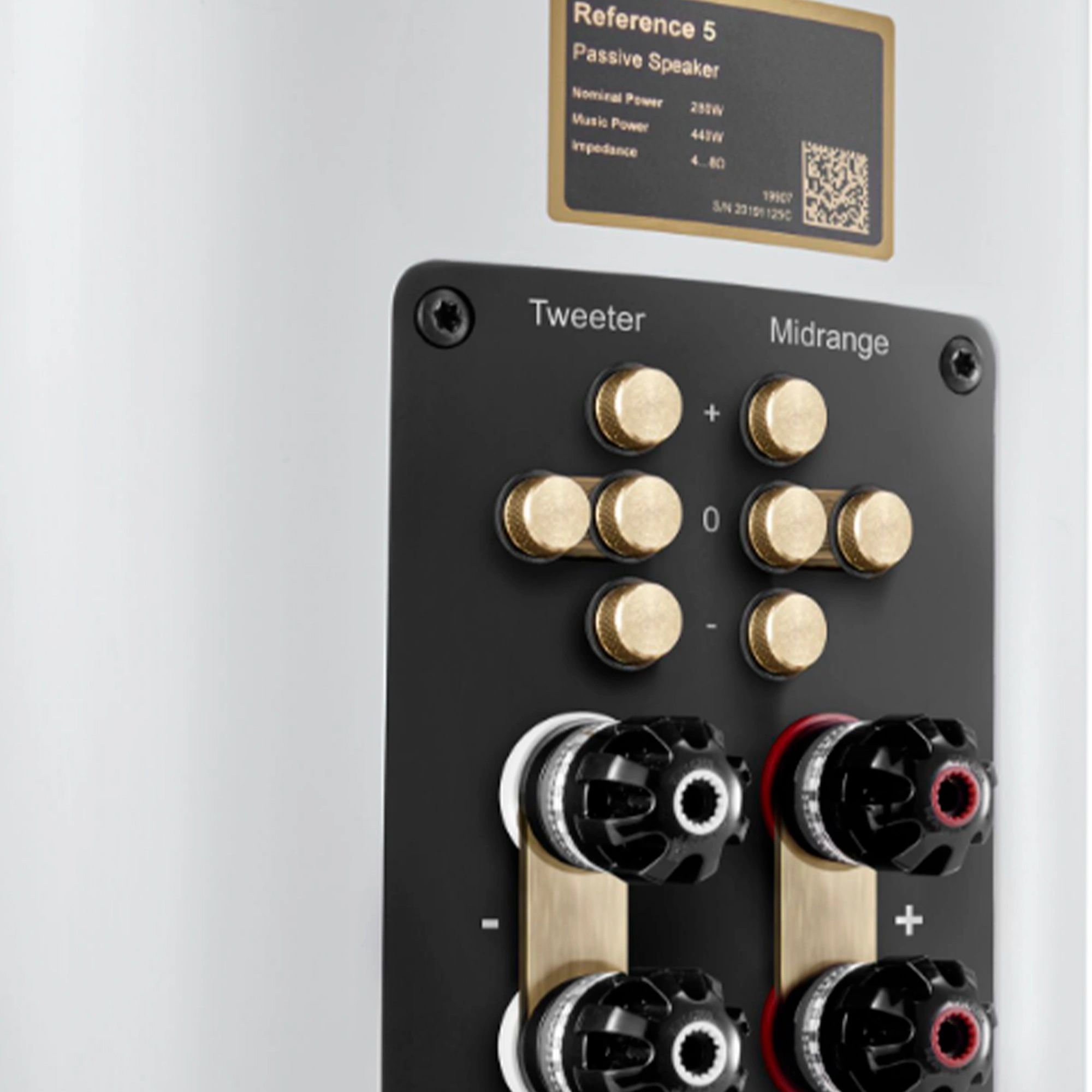 The Reference 5 speakers are equipped with high-quality WBT nextgen connectors and allow bi-wiring and bi-amping. These connectors are the basis for excellent sound quality and provide long-term stable contact. If you do not want to use the bi-wiring or bi-amping mode, high-quality hard-gold-plated copper bridges are included. The Reference 5s feature controls on the speaker terminal for Canton's RC (Room Compensation) technology. With this level adjustment, the sound pressure levels of the midrange and tweeter can be sensitively adjusted in 1.5 decibel steps. This allows the speakers to be optimally adapted to personal listening tastes and room acoustics.