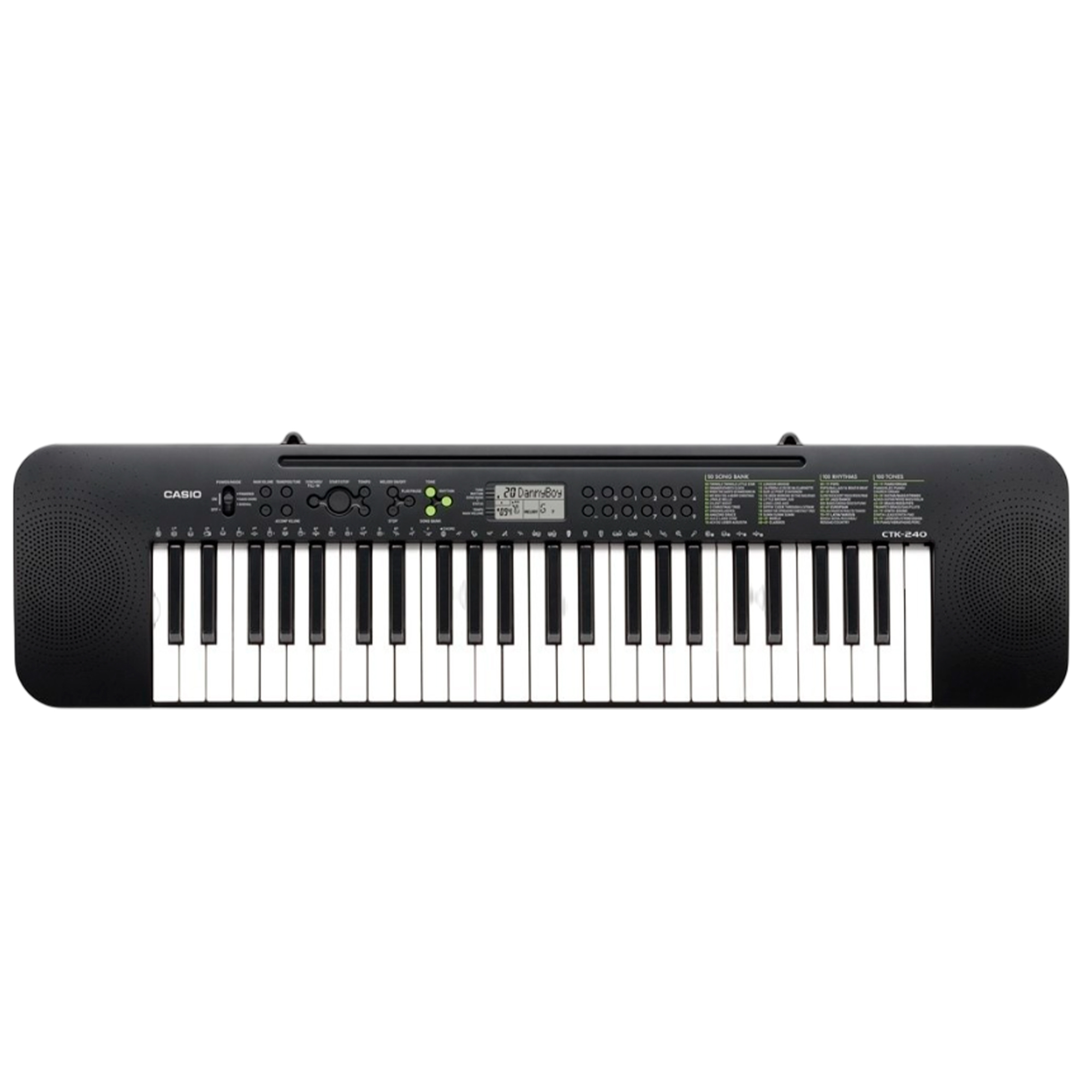 Inside the Casio CTK-240 synthesizer, there are 100 tones and 100 rhythmic auto-accompaniment patterns, with the ability to change the tempo from 20 to 255 beats per minute. There are also 50 songs that you can play along with for learning or enjoyment.
