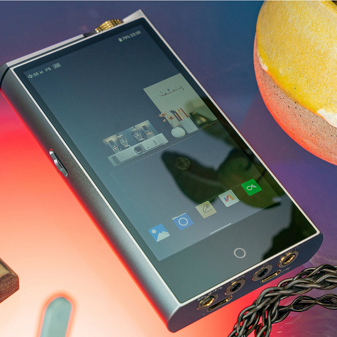 The amplifier, also based on discrete transistors, supports Class A and AB modes and can deliver up to 330 mW through the 3.5 mm and 690 mW through the balanced 4.4 mm output, making the player versatile for both sensitive in-ear models and tough full-size headphones. Separate power for digital and analog circuits reduces noise levels, and the optimized power system allows for up to 13 hours of operation without recharging.