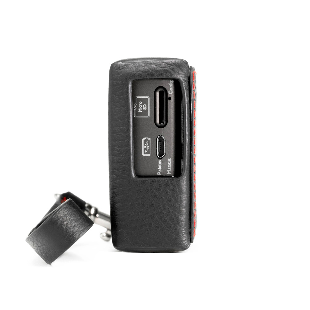 The black genuine leather is stitched with a contrasting red thread. The case allows access to the card reader, charging port, indicators, controls, and headphone outputs.