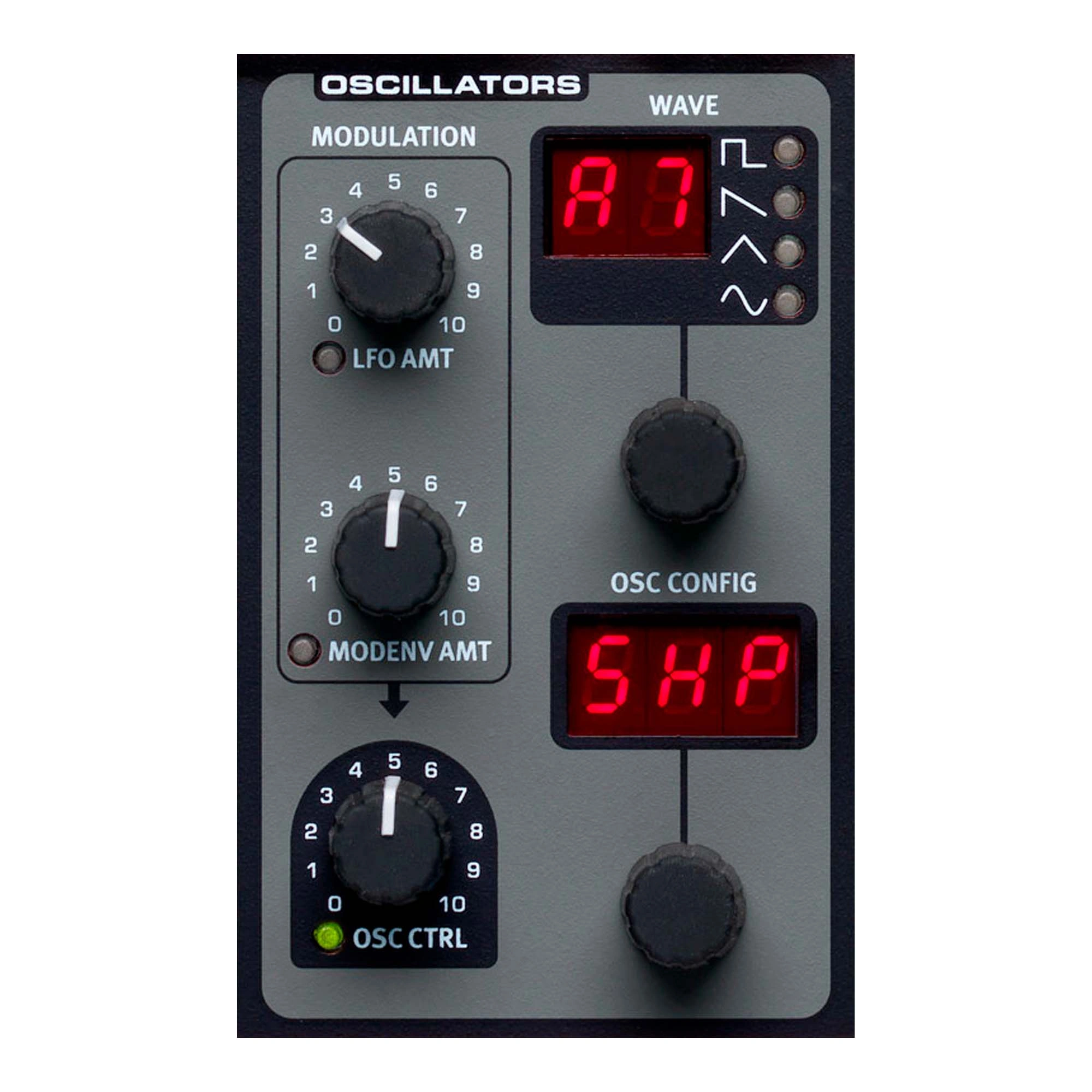 - Oscillators: Unique Oscillator concept, 8 Oscillator Configurations, Pitch, Detune, Shape, Sync, AM, Noise, Sub Mix, FM