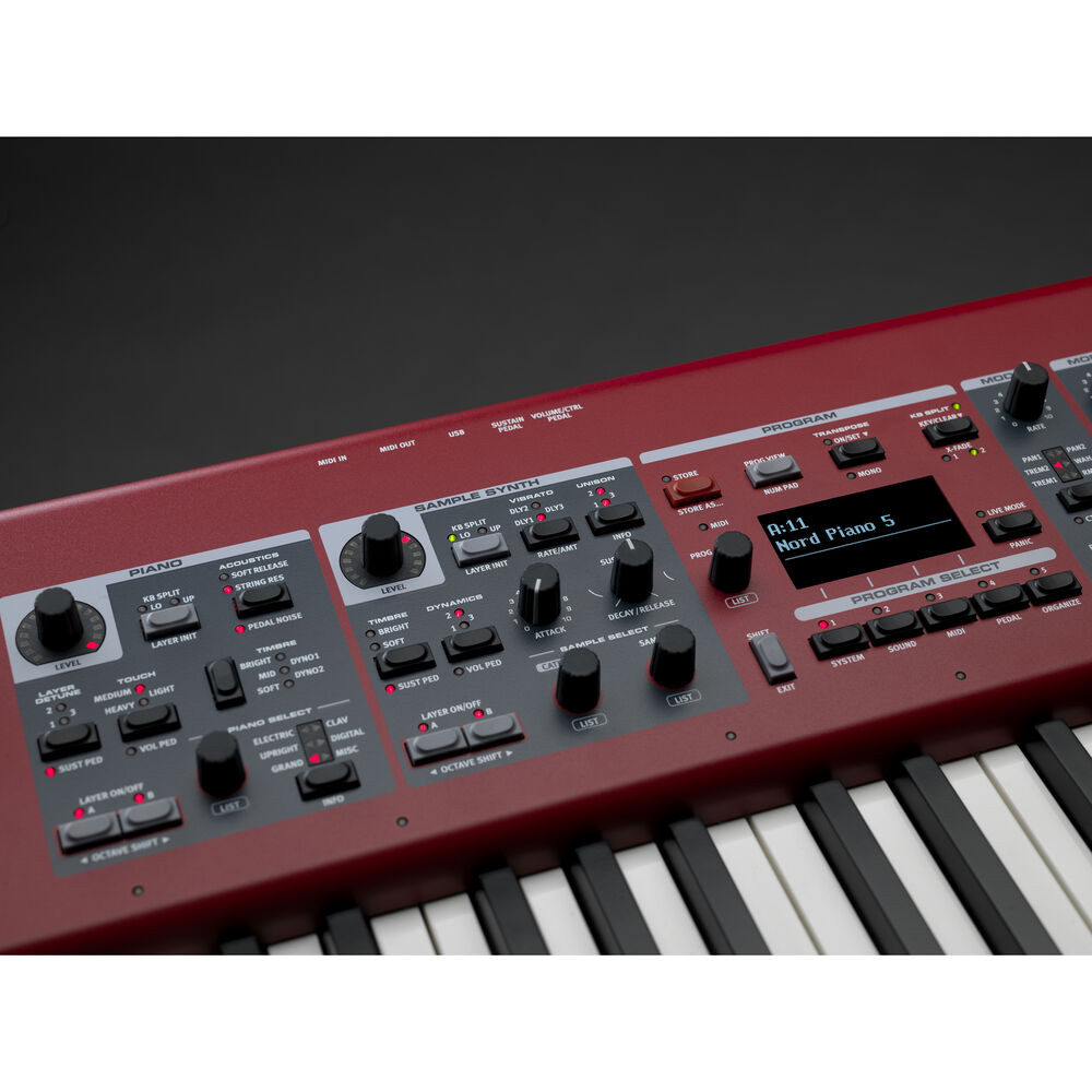 The synthesizer section is based on a completely new format and features a wide range of new sounds such as solo brass, solo strings, basses, guitars, as well as an extensive collection of classic analog leads and basses. It also includes samples from Symphobia and Swing. All sounds can be quickly replaced using the Nord sound manager. You can also create your own instrument samples using the unique free Nord Sample Editor software for Mac and Windows.