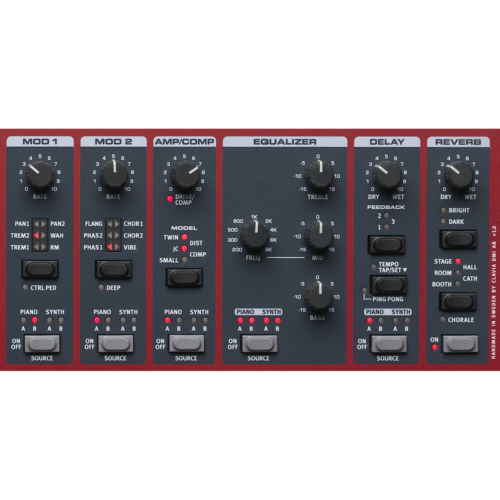 The Nord Piano 5's Piano and Sample Synthesizer sections each contain two independent layers. Two pianos and two sample synthesizers can be used simultaneously in different configurations with splitting or layering. Combined with versatile effects routing, a wide range of combinations can be achieved - from classic ensemble settings to rich soundscapes. LED level controls provide quick and precise balancing of all layer volume levels. The volume pedal and/or sustain pedal can be assigned to each layer.