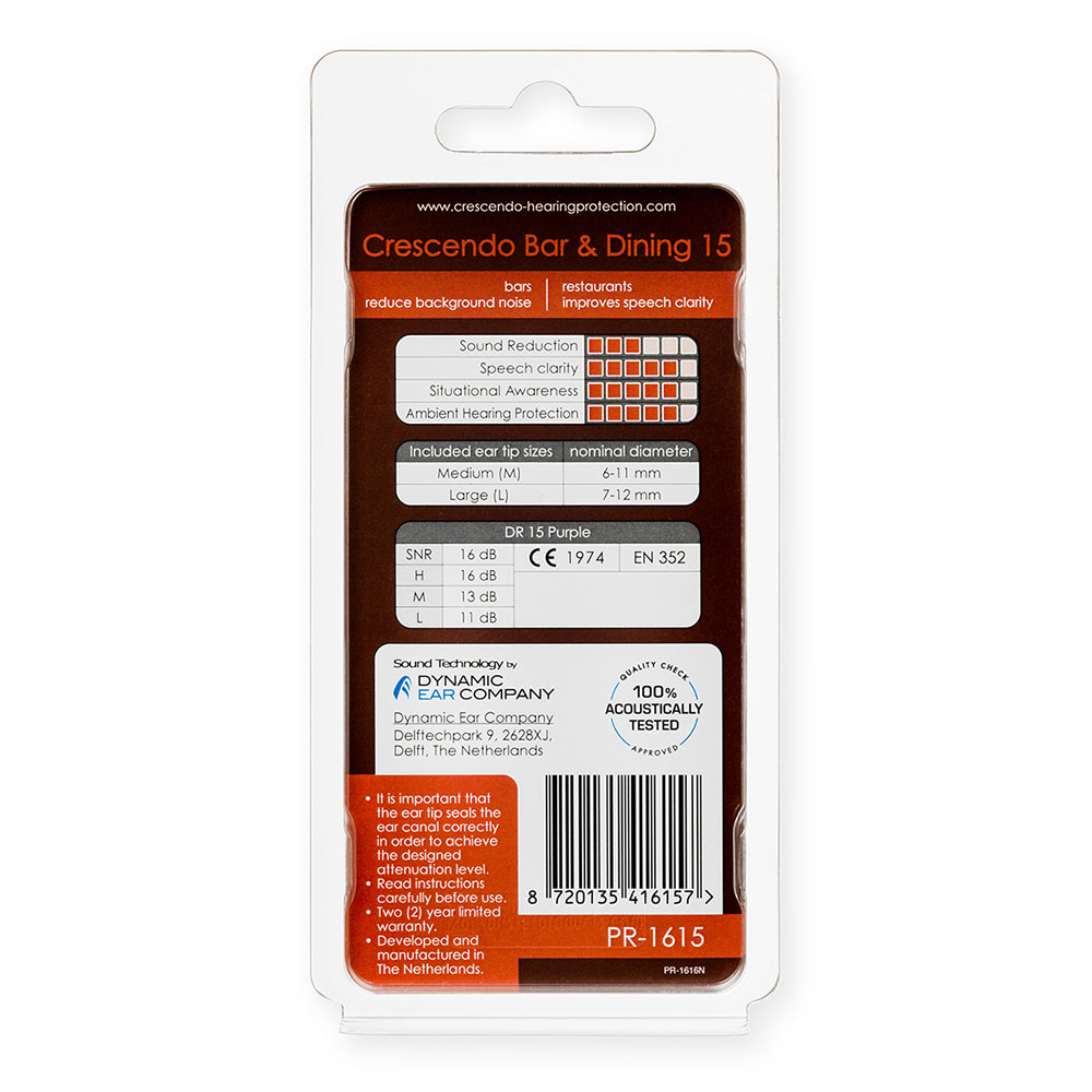 Crescendo Bar & Dining 15 are very discrete eartips with acoustic filters that turn the volume down just a little bit with an average of 16dB. This makes your acoustic environment somewhat smaller, making it suddenly a lot easier to concentrate on a conversation. The continuous noise around you is being muted and brought to the back, making your evening even more and longer enjoyable.