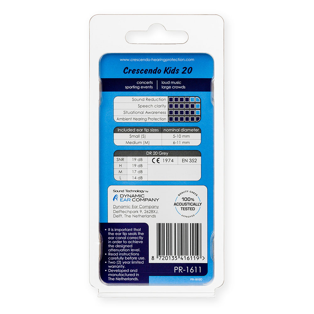Crescendo Kids’ ear plugs come with hypoallergenic ear tips and sophisticated acoustic filters that are easily positioned into the child’s ear canal, providing a snug, sealed fit.