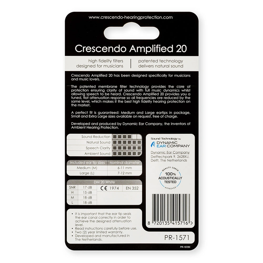The patented membrane filter technology provides the core of protection ensuring clarity of sound with full music dynamics whilst allowing speech to be heard. Crescendo Amplified 20 provides you a tuned, flat attenuation response so all frequencies are reduced by the same level, which makes it the best high fidelity hearing protection on the market.