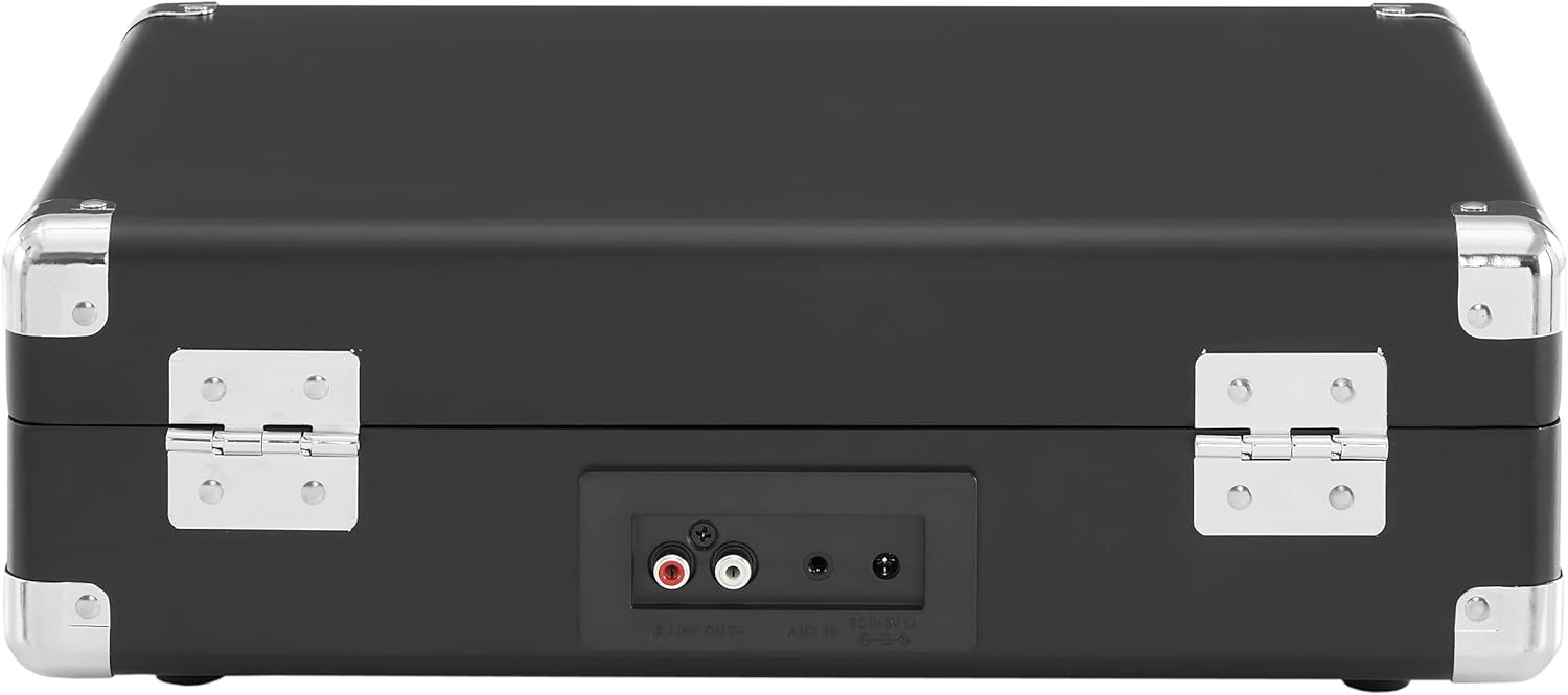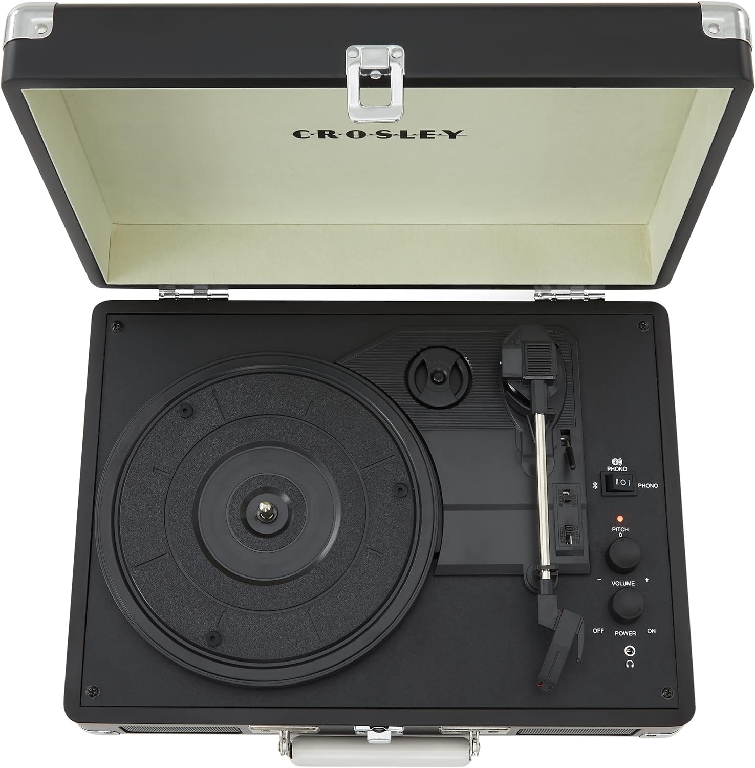 The Crosley Cruiser Plus record player features a classic finish in black leather with red velvet inside, making it a beautiful accessory in your room.