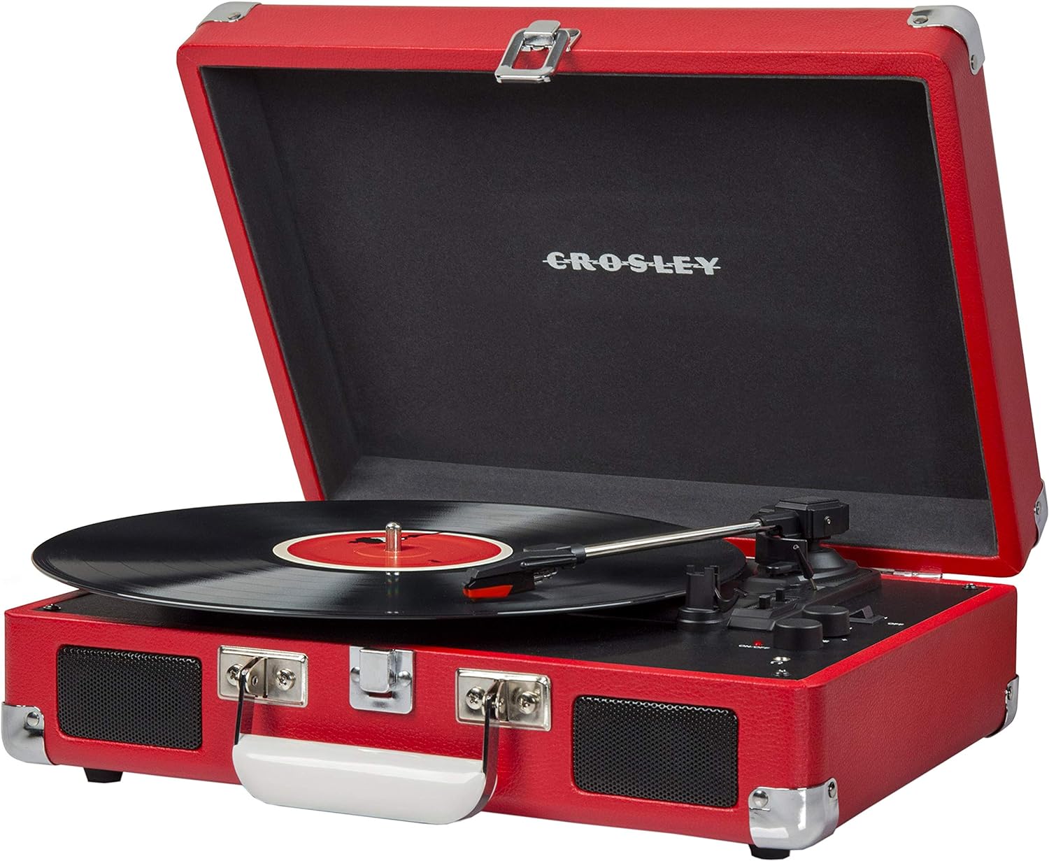The Crosley Cruiser Plus vinyl turntable in a classic finish of black leather with red velvet inside will be a beautiful accessory in your room.