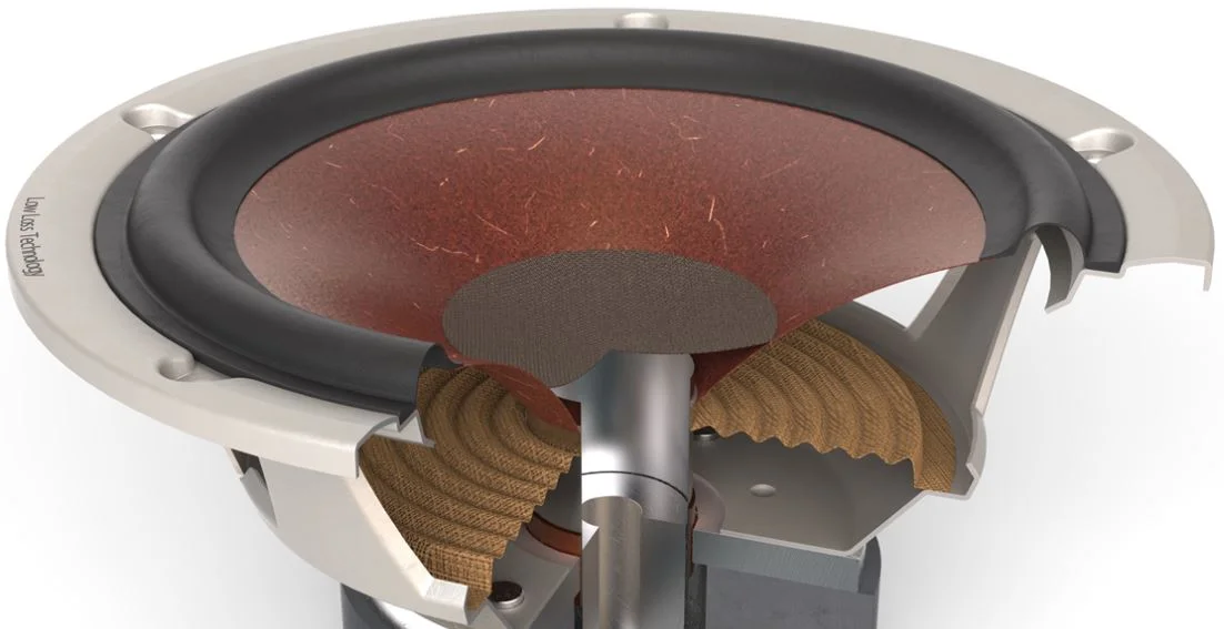 - Pair of 6.5-inch midrange drivers with paper cones reinforced with wood fibers;