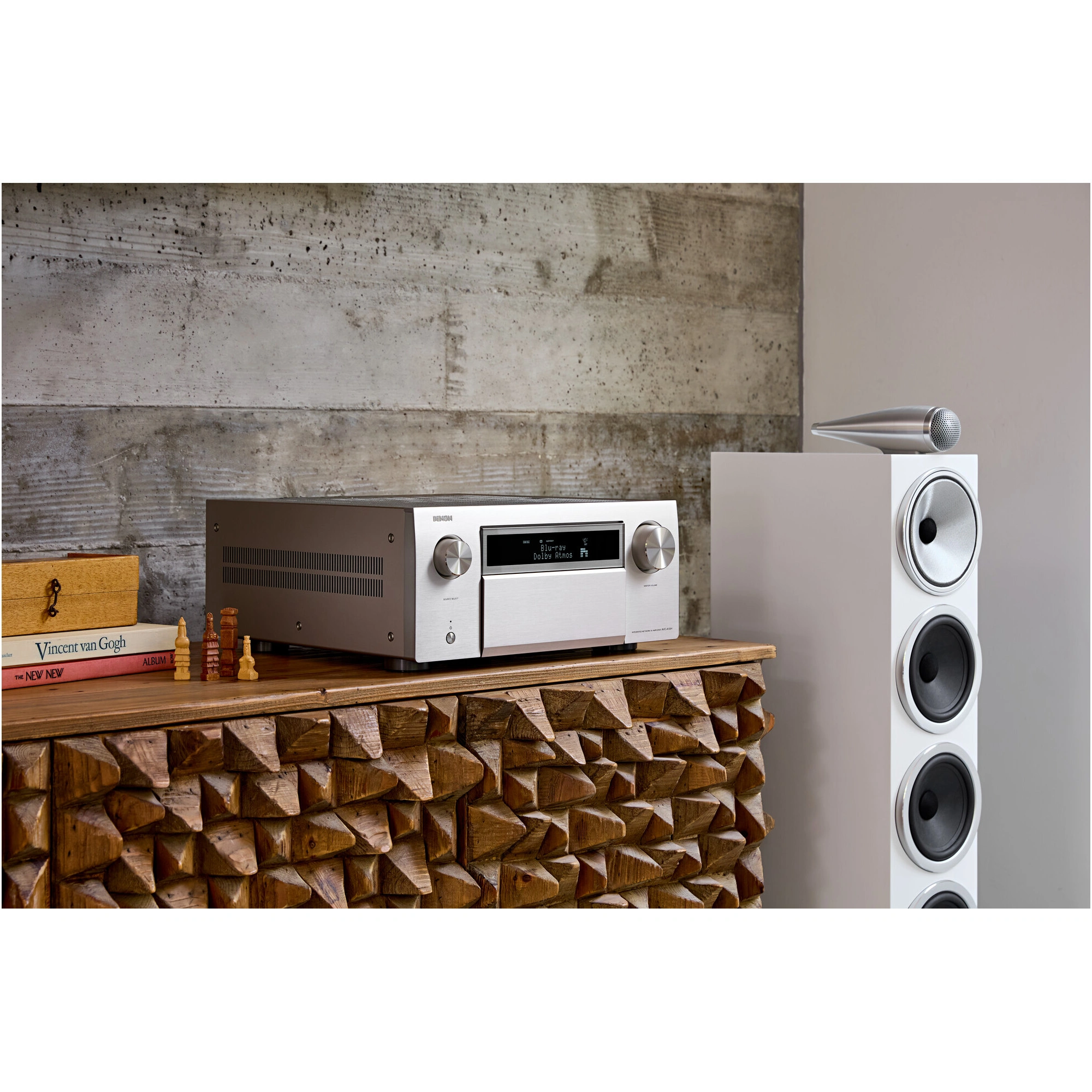 Nine two-channel 32-bit audiophile-grade DACs maximize resolution for all 17 channels. Premium components like low-jitter crystal oscillator and large transformer with capacitors enhance audio quality. Other enhancements include gold-plated speaker terminals and a rigid construction to reduce vibrations and interference.