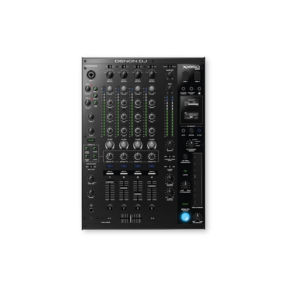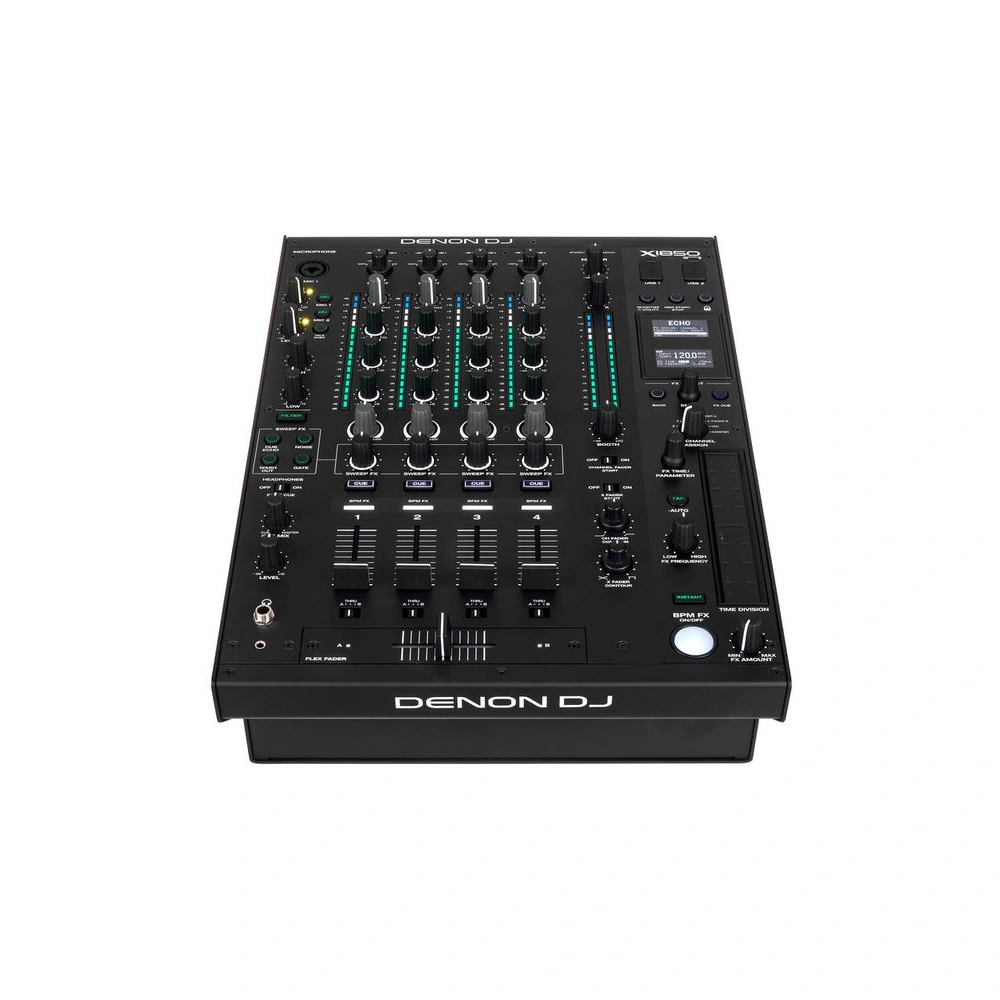 The Denon DJ X1850 Prime is a digital 4-channel professional-level mixer equipped with two 24-bit/96 kHz sound cards, DVS support, Sweep FX, MIDI, touch strip with backlight, and OLED display. The central Pro-Mix section is perfect for creative DJs. This 4-channel digital mixer features multiple assignable inputs and Pro DJ FX.