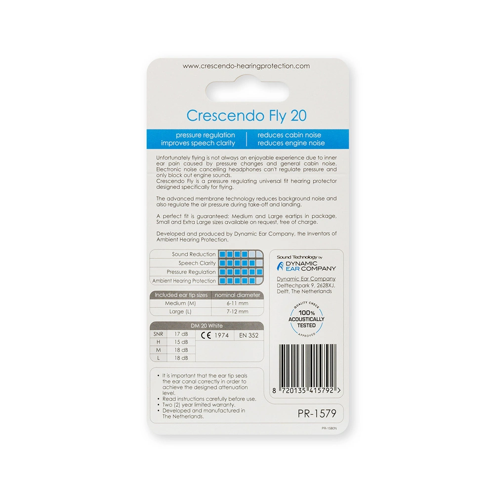 Crescendo Fly 20 - earplugs for flights. Using Fly earplugs during a flight allows you to avoid unpleasant consequences of pressure changes on the eardrums during takeoff and landing. The filters work like gentle valves and ensure the balance of pressures between the external environment and the middle ear. This gives the Eustachian tube enough time to react to pressure changes.