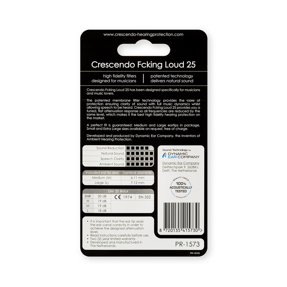 The patented membrane filter technology ensures clarity of sound with full dynamic range, while still allowing for speech intelligibility. The Crescendo Fcking Loud 25 provides a tuned, flat attenuation response, so all frequencies are reduced to the same level, making it the best hearing protection option with high fidelity reproduction.