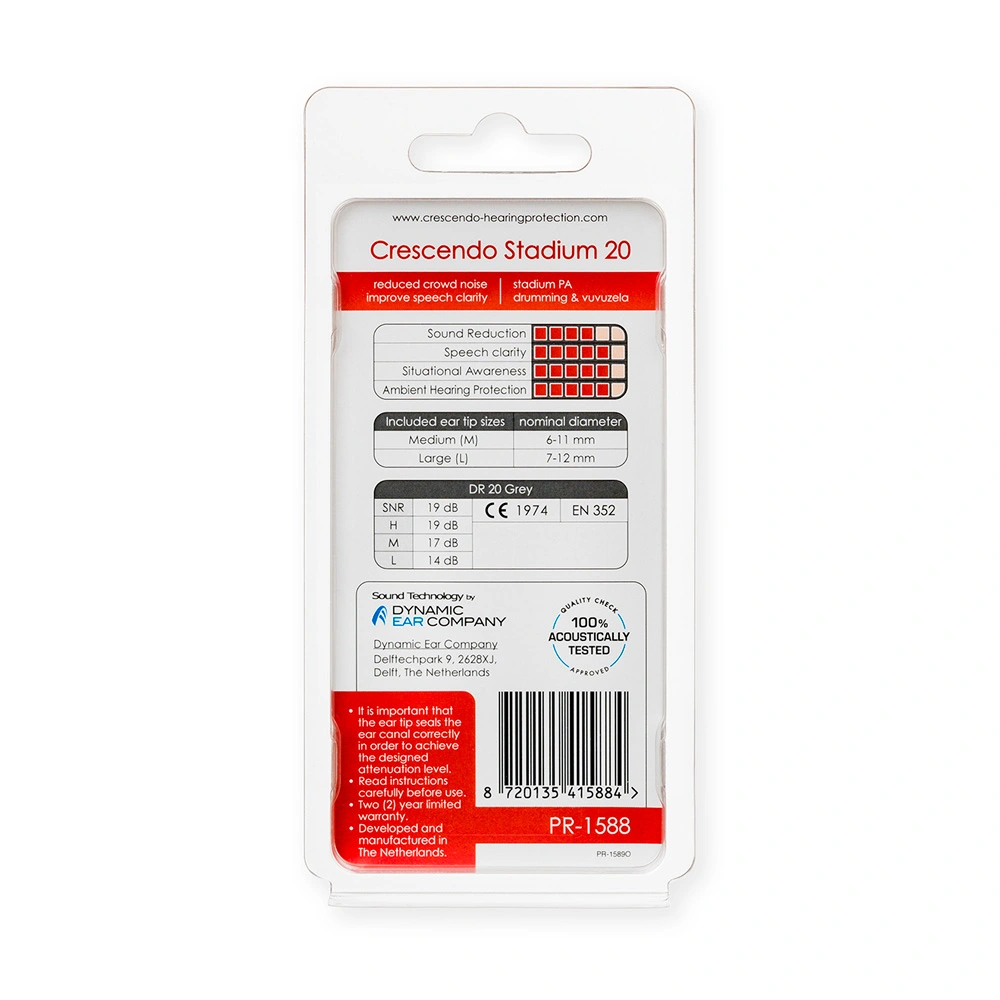 Stadium filters provide sound reduction to a safe level. Stadium 20 reduces sound levels by 20 dB, making them suitable for continuous use for several hours.