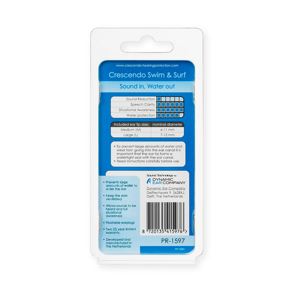 Crescendo Swim Surf 5 are universal washable earplugs specifically designed for bathing, swimming, and protection against moisture.