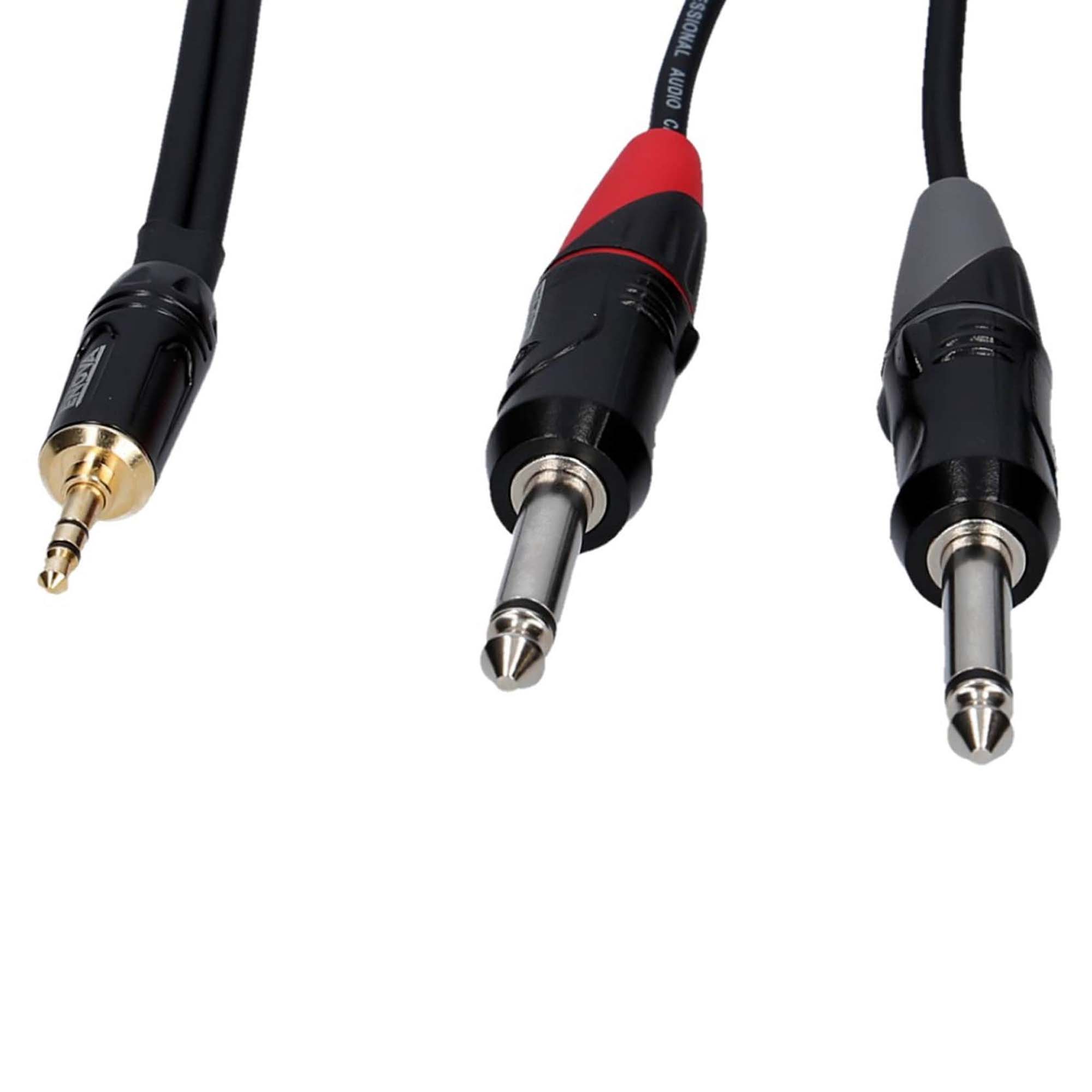 Professional stereo audio transmission 3.5 mm stereo jack plug (TRS) to two 6.35 mm mono jack plug (TS).