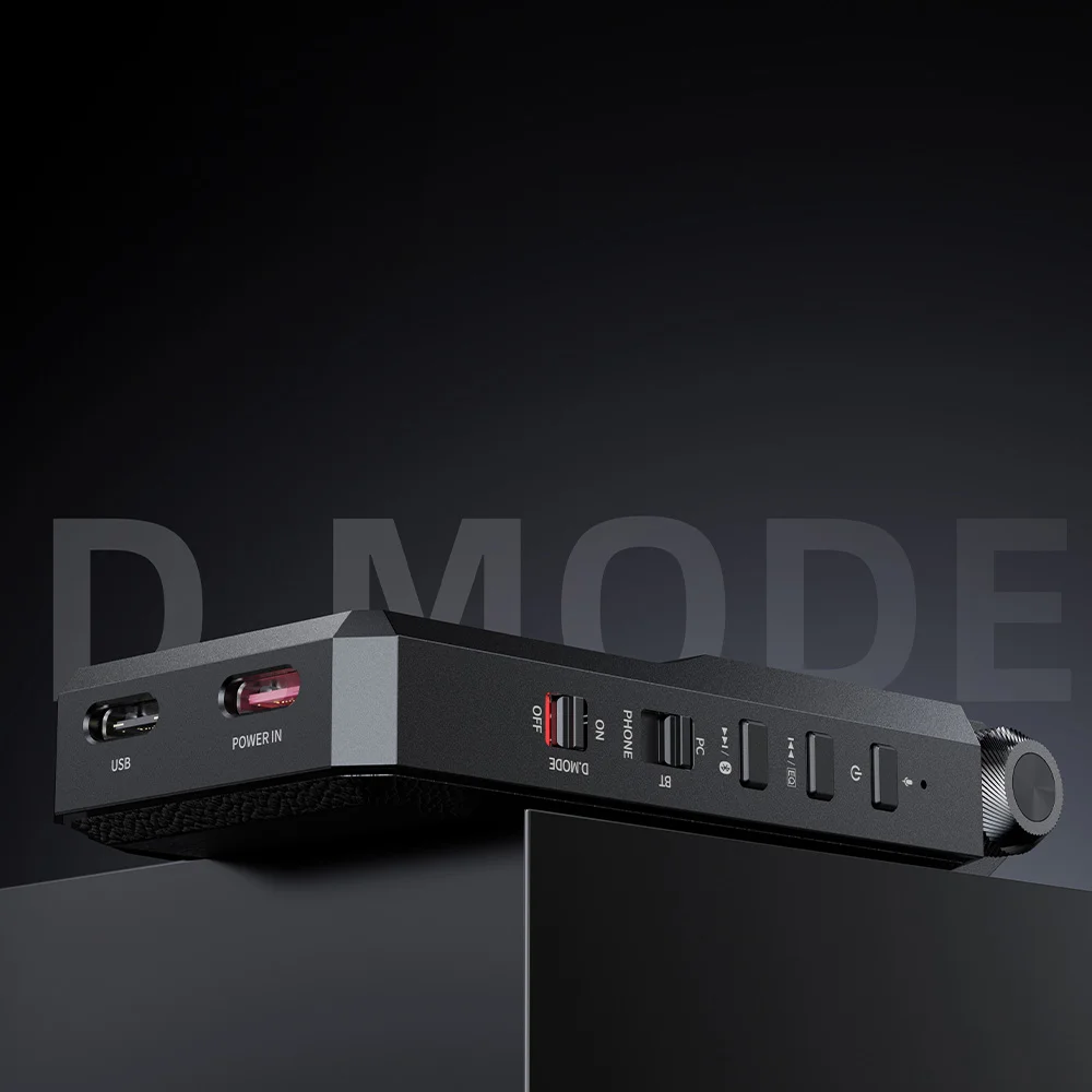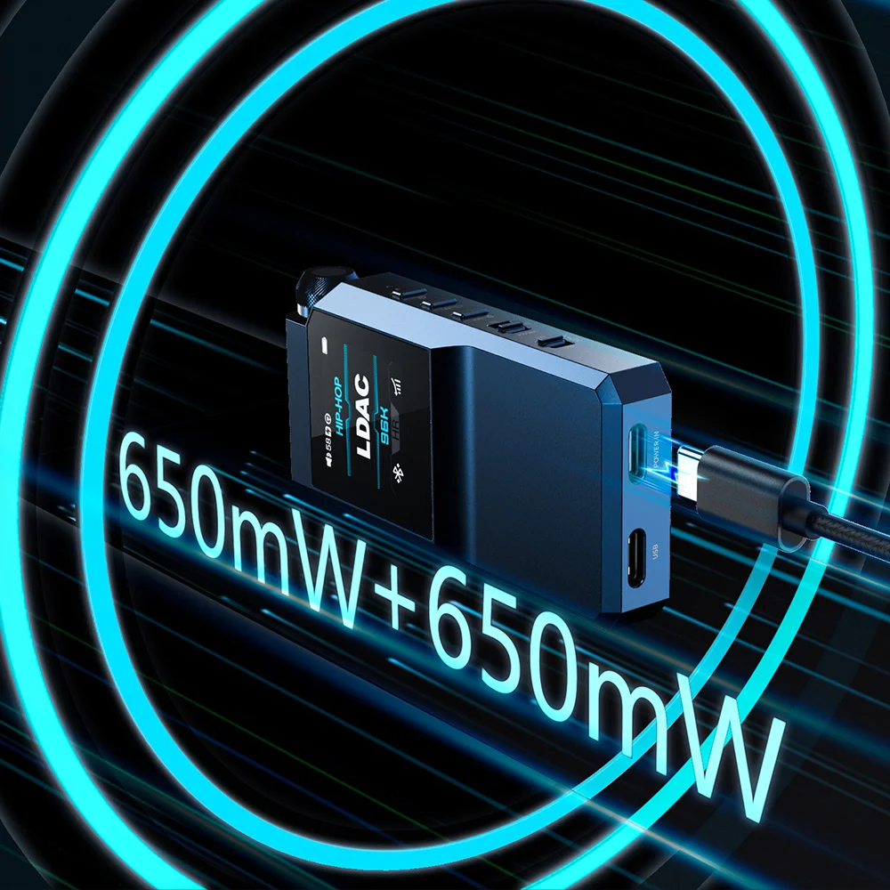 The BTR 17 features a special D.Mode switch and a port for connecting an external independent power source. In desktop mode, when you connect the BTR17 to your phone as a DAC and headphone amplifier, you can also connect an external power source to the BTR 17 via a dedicated power port. This means the BTR 17's battery will be fully charged via USB, allowing for powerful sound output without recharging the phone's battery.