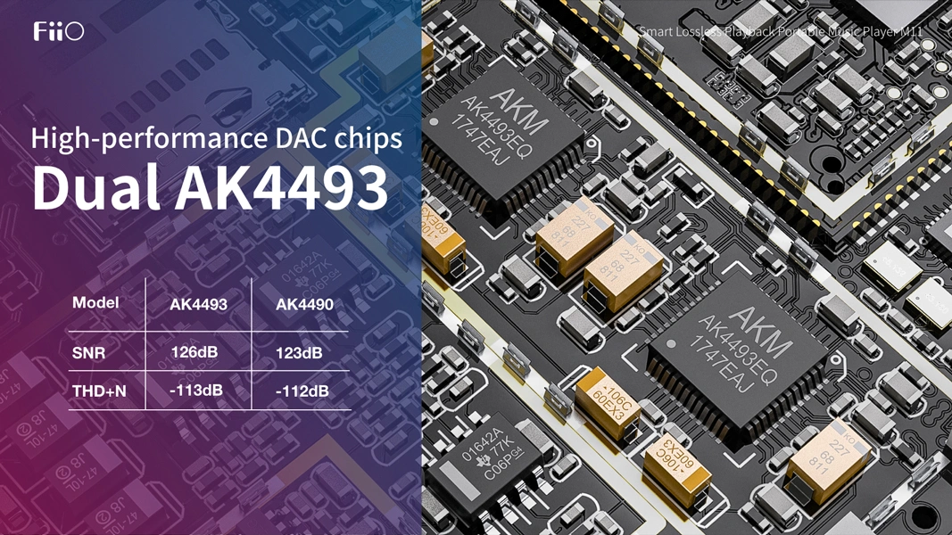Inside the M11 are two AKM AK4493 DACs decoding your music. Compared to the predecessor AK4490, the signal-to-noise ratio (SNR) has doubled, and signal distortion has been reduced by 1 dB, significantly enhancing sound quality.